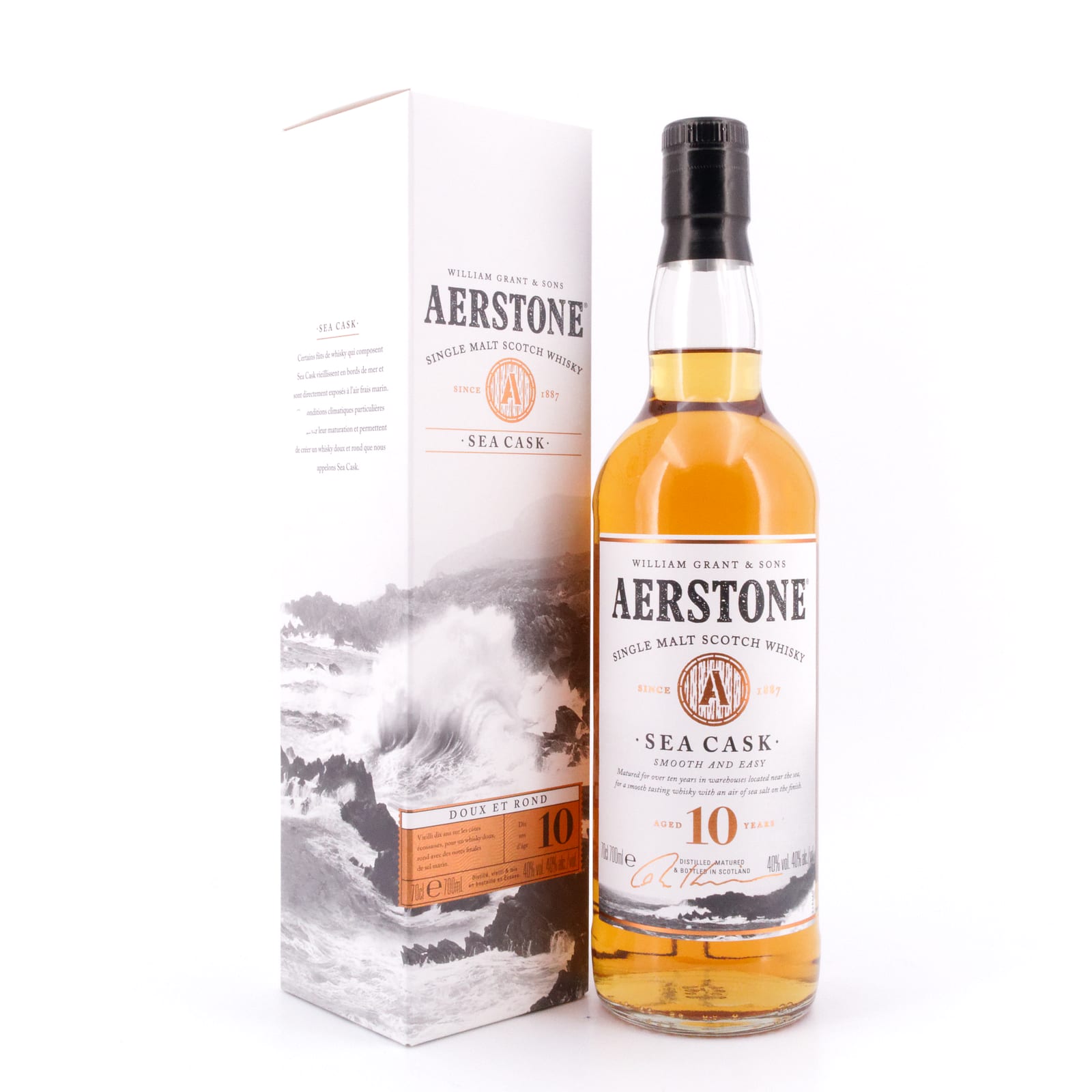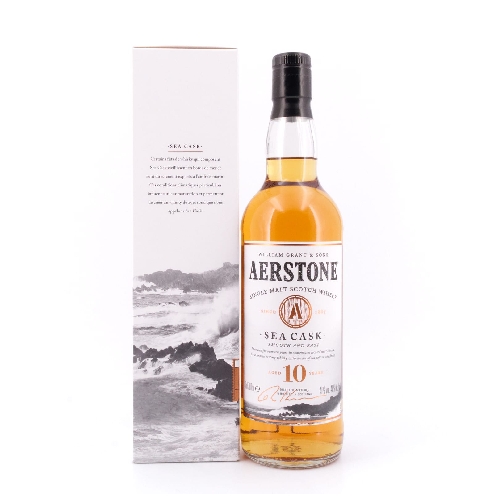 Der „Aerstone Sea Cask“ ist die Abfüllung eines nicht näher bekannten Single Malts aus den Lowlands. Man mag hier spekulieren, ob es sich hier vielleicht um einen Whisky der Ailsa Bay Destillerie in Girvan handelt, da die Brennerei zu „William Grant & Sons“ gehört, die den „Aerstone“ herausgebracht haben. Aber man weiß es nicht. Den „Aerstone“ gibt es in zwei Varianten, einmal als „Sea Cask“, einmal als „Land Cask“. Das Ziel dabei: die Whisky-Sprache für Neueinsteiger zugänglicher machen, dabei erfahrene Whisky-Liebhaber gleichermaßen begeistern. Das Konzept dahinter ist charmant wie schlüssig, ein Malt lagerte unmittelbar an der See, der zweite Malt im Landesinneren. Den Beinamen Sea Cask trägt dieser „Aerstone“ also deshalb, da der abgefüllte Whisky zehn lange Jahre in Lagerhäusern an der Küste Ayrshires lagern durfte.