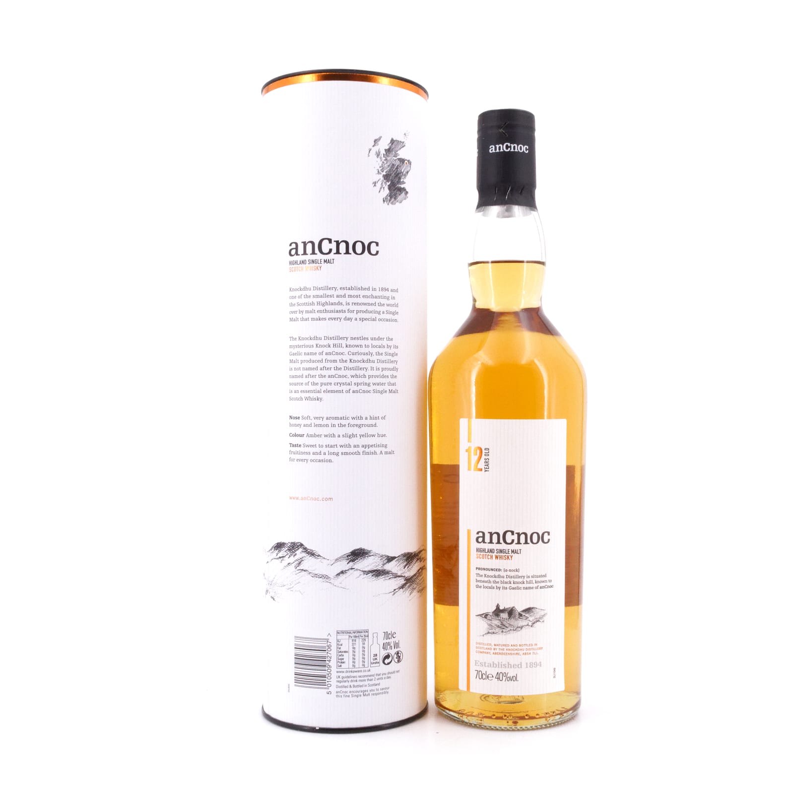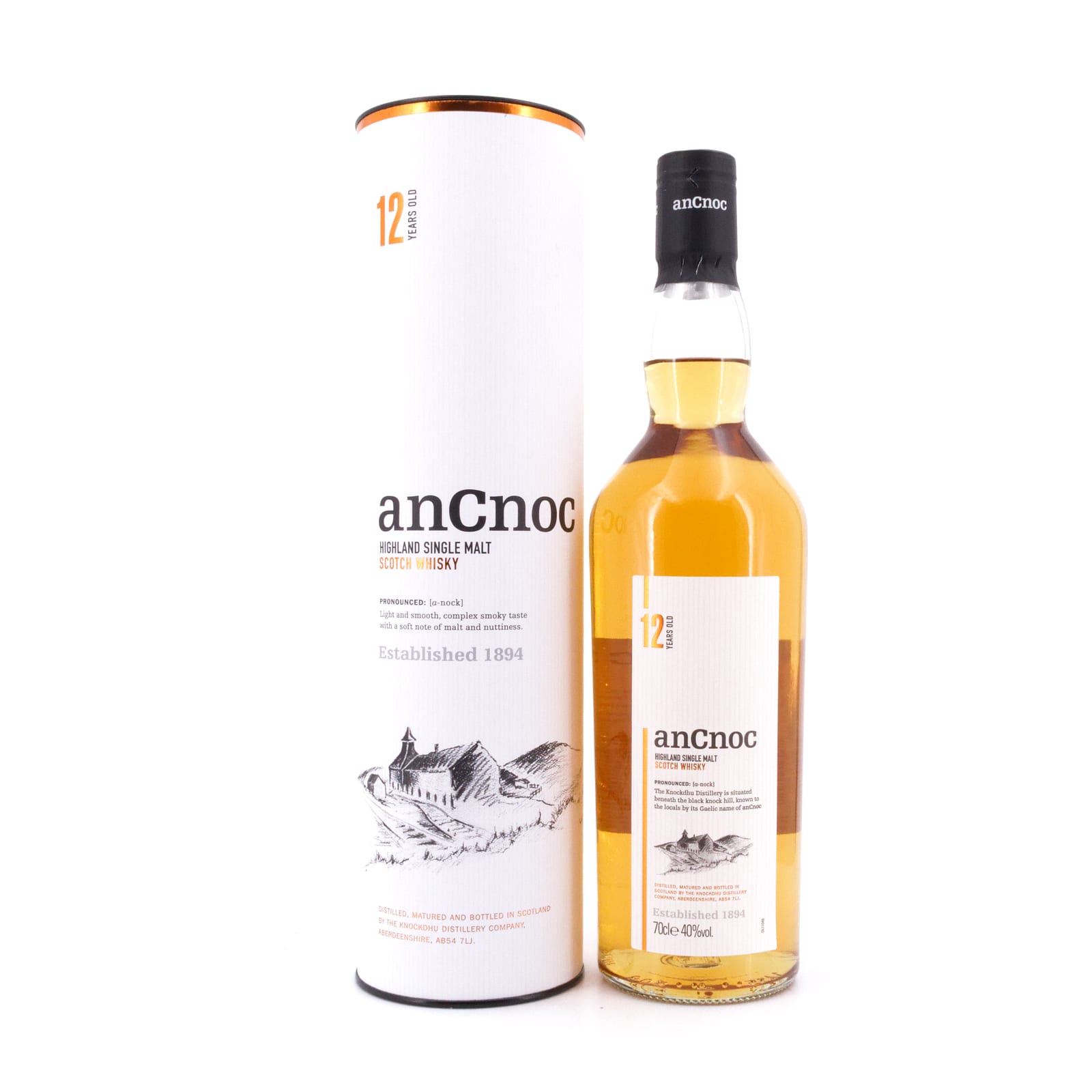 Die Malts der Destillerie anCnoc (vormals: Knockdhu) im Herzen der Speyside sind eher unbekannt - und dies eigentlich zu Unrecht. Haben Sie doch ein bemerkenswertes Preis-Leistungsverhältnis und teils untypische Geschmacksnuancen. Das Aroma des 12 Jahre gereiften an Cnoc setzt sich im Vordergrund aus milden aromatischen Noten von Honig und Zitrone und einem Hauch von Rauch zusammen. Der Geschmack ist sehr weich mit anfänglich süßen Aromen, die später von aromatischen Früchten wie frischen Pfirsichen abgelöst werden und die bis in den langen und milden Abgang erhalten bleiben.