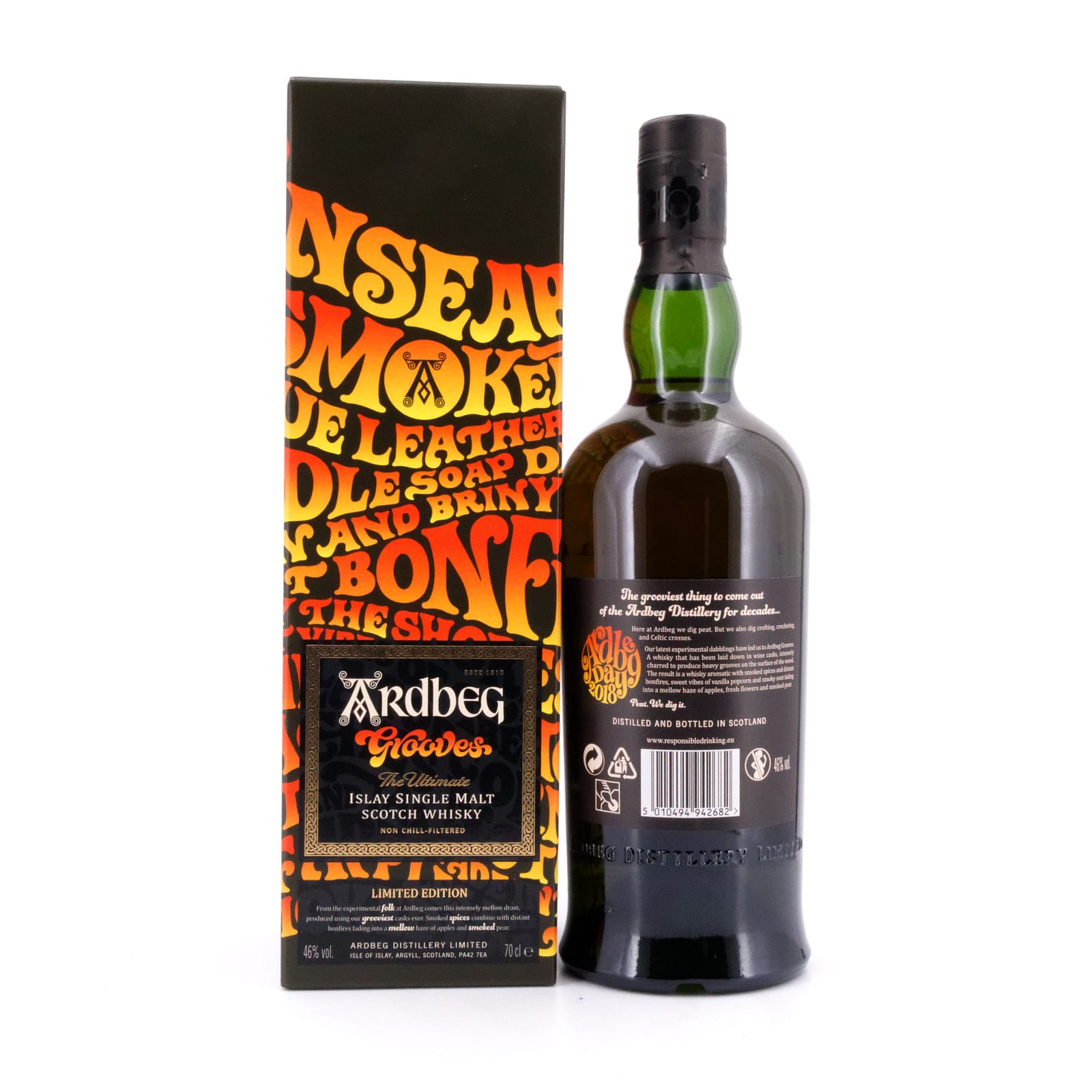 Für das Jahr 2018 ist es der „Ardbeg Grooves“, der den ehrenvollen Titel der Festival-Abfüllung tragen darf. Ein Teil dieser Abfüllung lagerte in ehemaligen Rotwein-Fässern, die vor ihrer Befüllung mit Whisky so intensiv ausgebrannt wurden, dass im Fass-Holz tiefe Furchen (engl. Grooves) entstanden. Herausgekommen ist ein Whisky (46 Vol%) intensiv und alternativ, zwischen Vergangenheit und Zukunft mit Blick in eine ganz besondere Zeit.