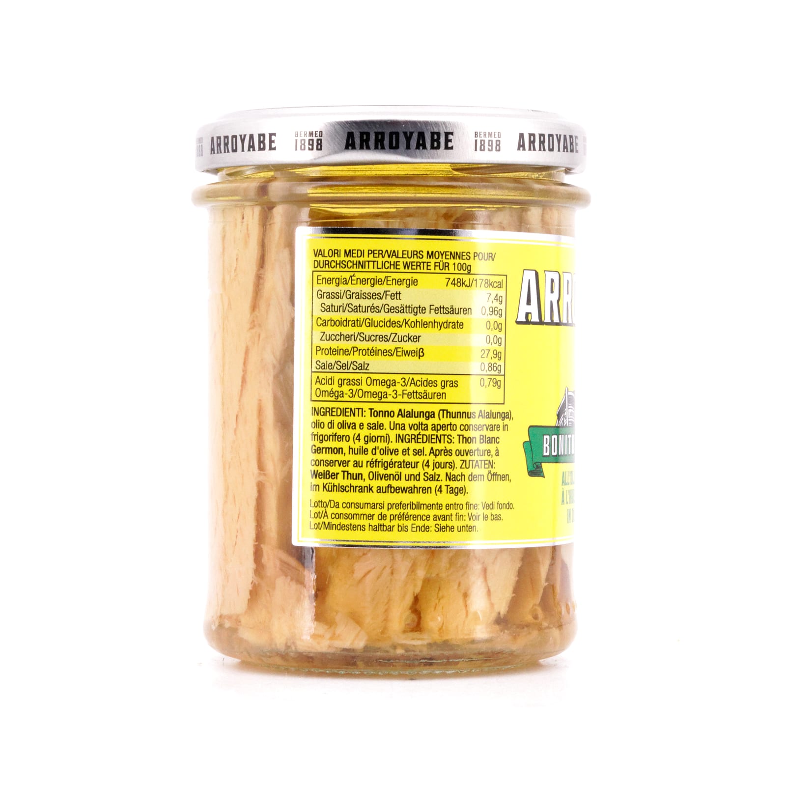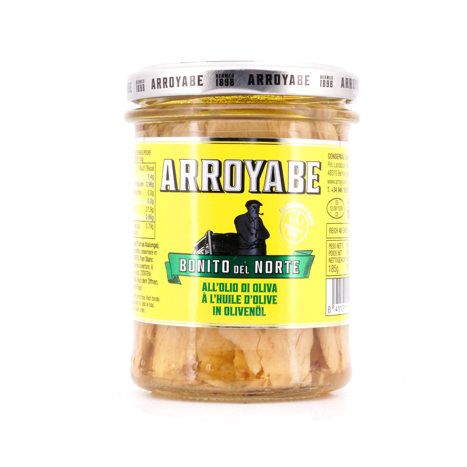 Dieser „Arroyabe Weißer Thunfisch in Olivenöl“ wird auch heute noch traditionell und mit viel Handarbeit eingelegt. Gefangen zwischen Juni und November in der Biskaya, wird der Fisch handfiletiert, gegart und anschließend in bestes Olivenöl eingelegt.