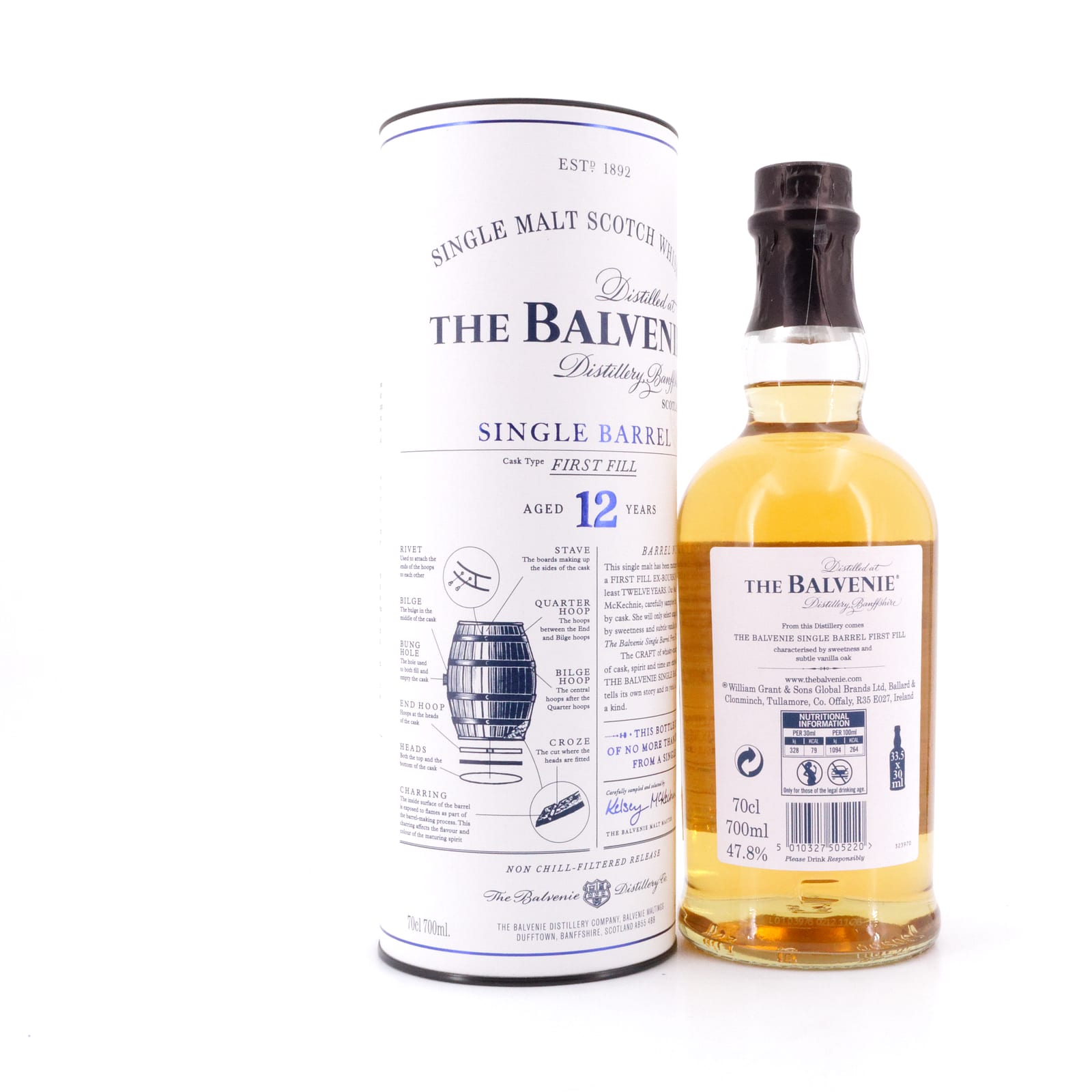 Die Balvenie Distillery, gegründet 1892 in Dufftown, Schottland, ist bekannt für ihre handwerklich hergestellten Single Malt Whiskys. Der Balvenie 12 Jahre First Fill Single Barrel reift ausschließlich in erstmals befüllten Ex-Bourbonfässern aus amerikanischer Weißeiche, wobei jedes Fass maximal 300 Flaschen ergibt.