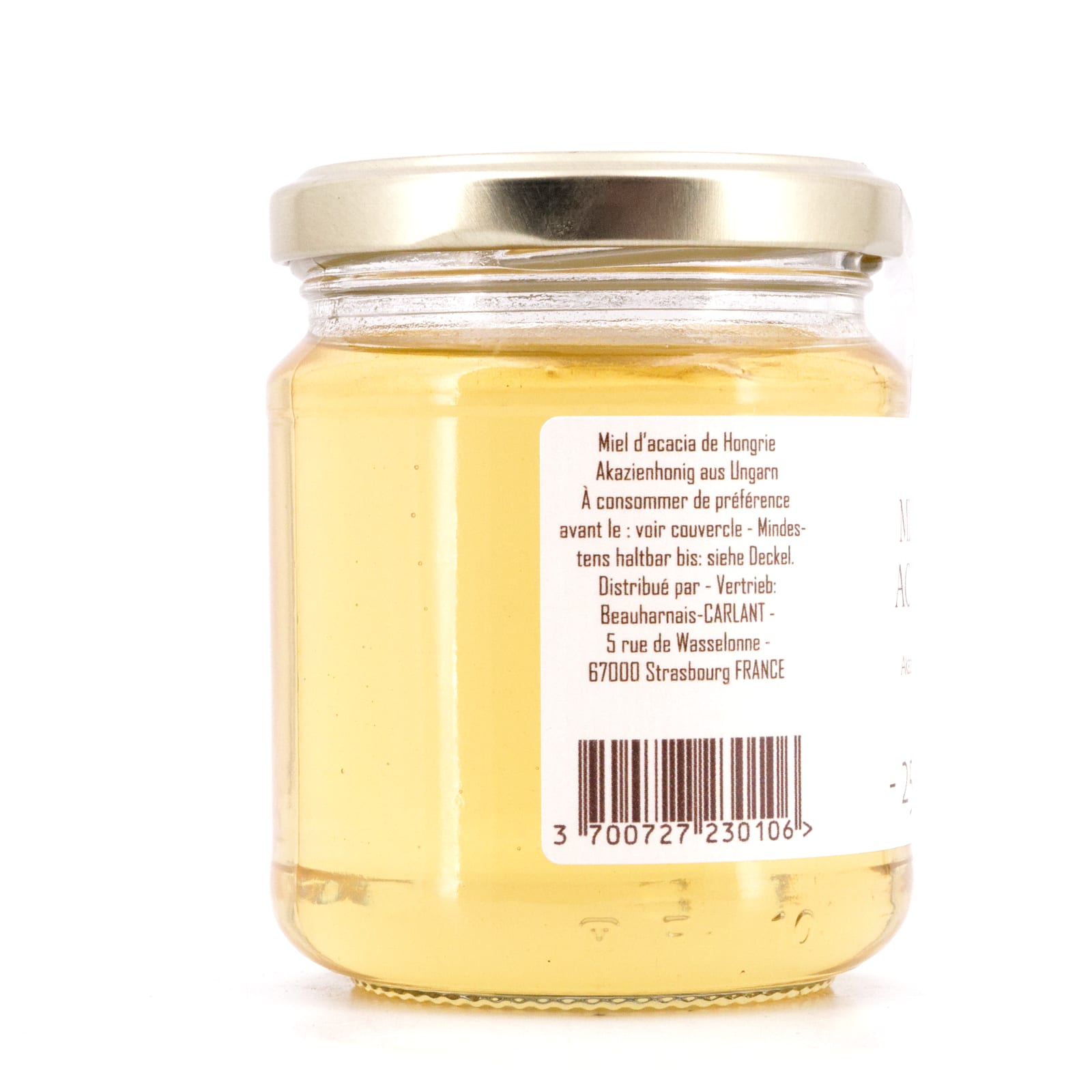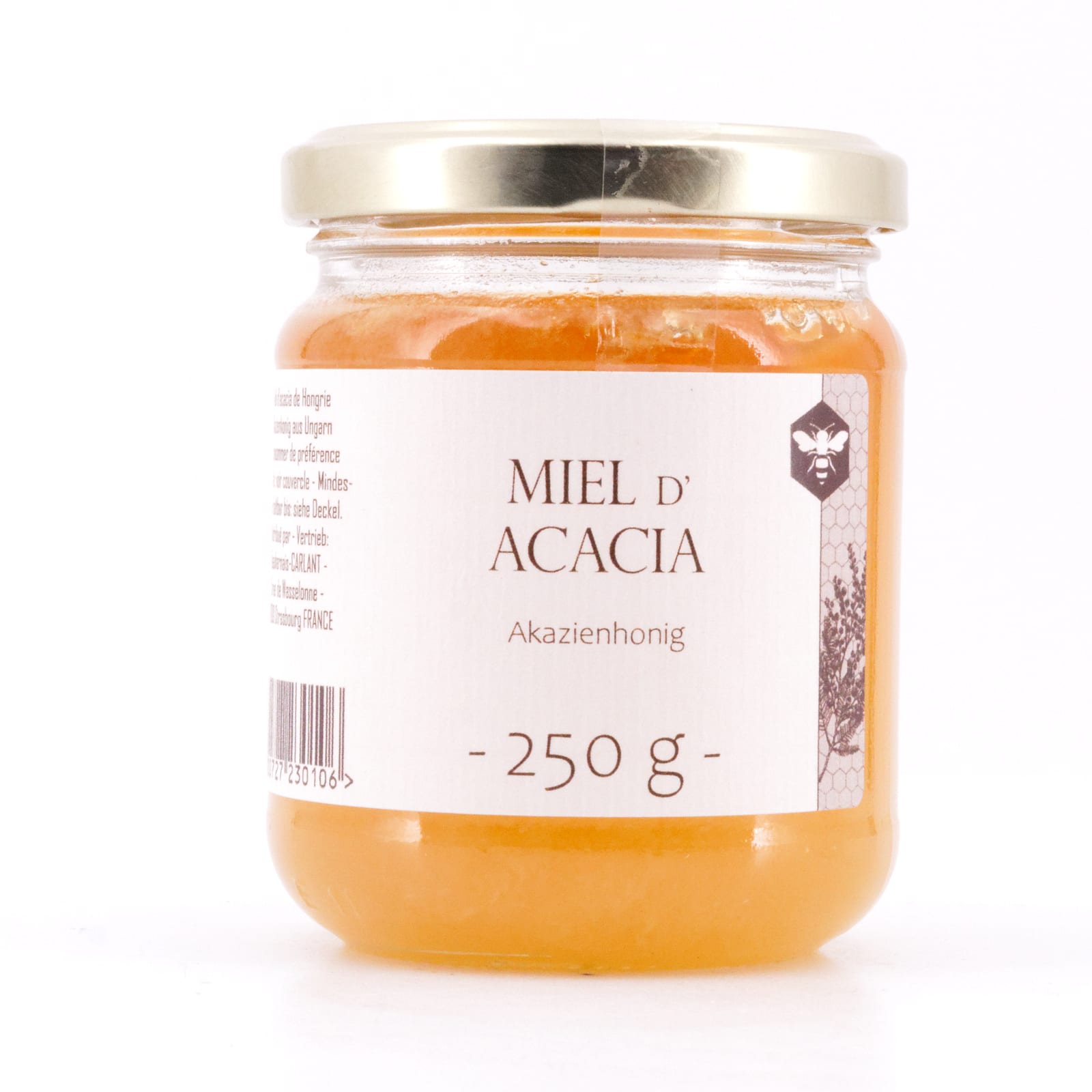 Der französische Feinkost-Anbieter „Beauharnais-Carlant“ hat neben einer Vielzahl deftiger, französischer Spezialitäten auch eine breite Palette süßer Köstlichkeiten im Angebot. Darunter auch eine Reihe unterschiedlicher Honig-Sorten wie einen „Miel de Provence“ aus dem südöstlichen Frankreich oder diesen fein goldenen „Miel d‘Acacia“ aus Ungarn.