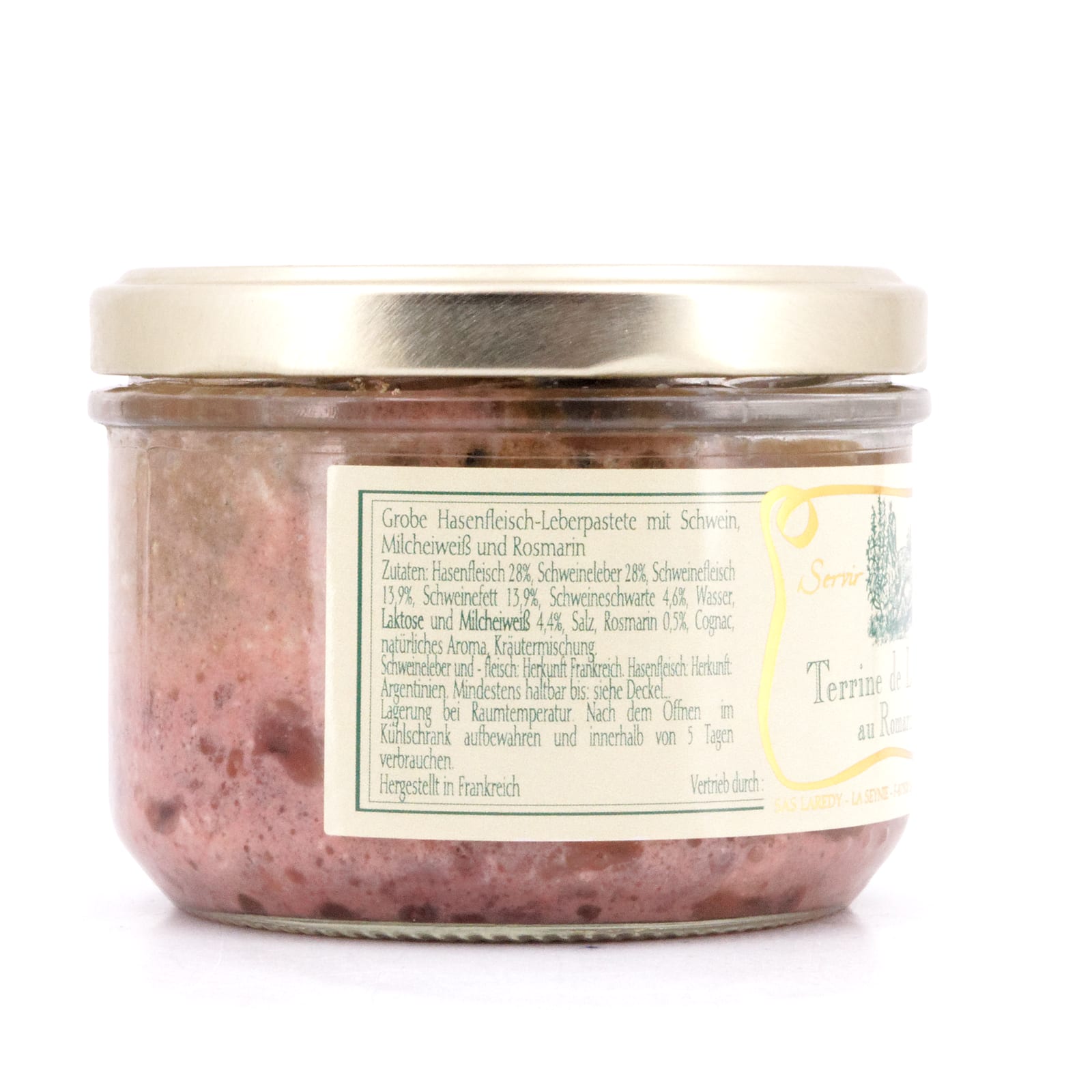 Zutaten: Grobe Hasenfleisch-Leberpastete mit Schwein, Milcheiweiß und Rosmarin