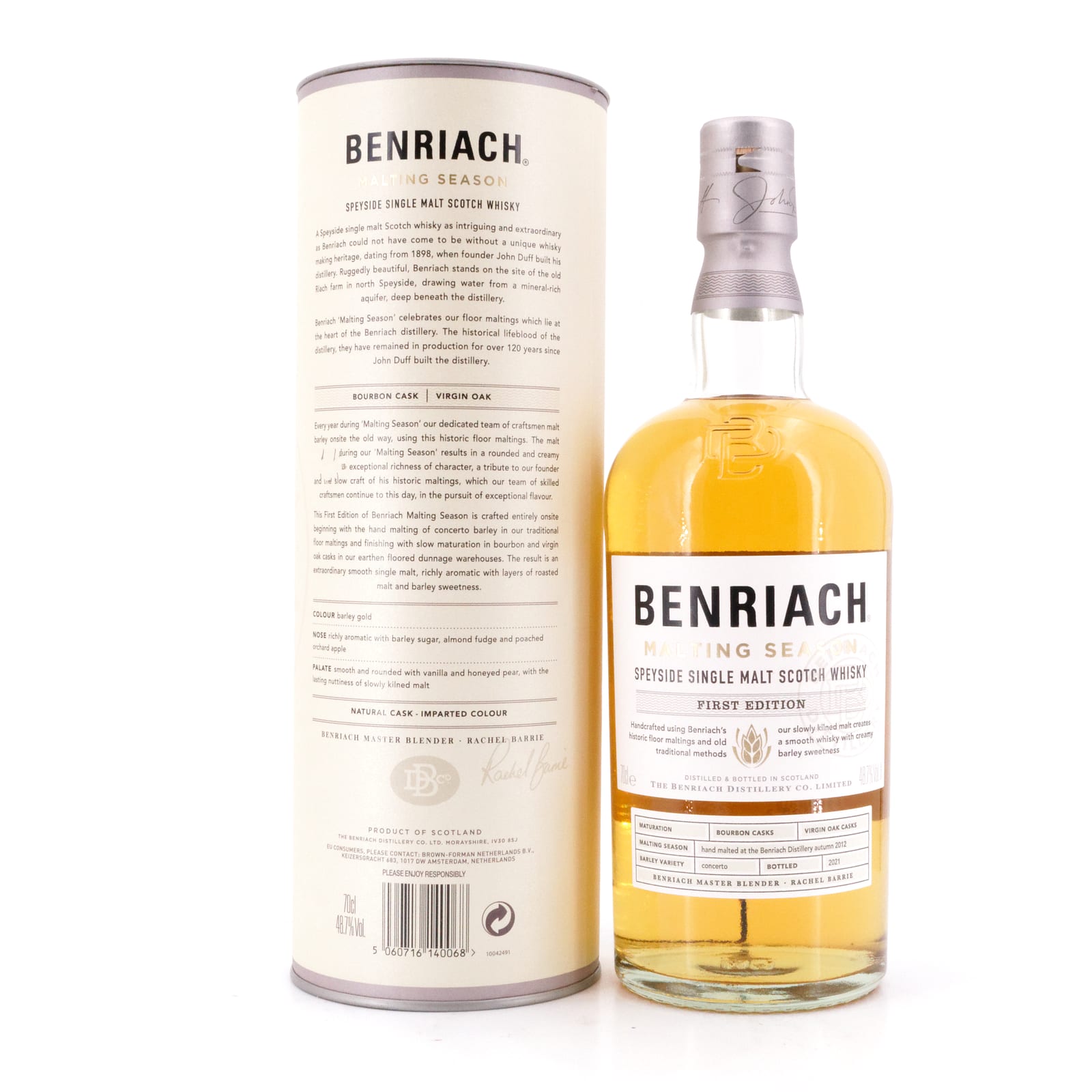 Die Benriach Distillery in der Speyside steht seit 1898 für charakterstarke Single Malts mit Sinn fürs Experiment. Mit der Malting Season First Edition rückt Benriach eine seltene Seite der Whiskyherstellung in den Mittelpunkt: Gerste, die vollständig auf den historischen Malzböden der Brennerei gemälzt wurde. Gereift in Bourbon- und Virgin-Oak-Fässern, abgefüllt mit 48,7 % vol. und streng limitiert, zeigt diese First Edition den malzigen Kern der Destillerie besonders klar.