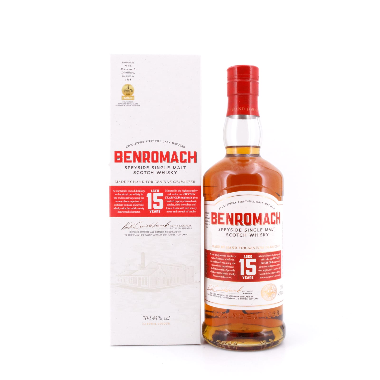 Dieser 15-jährige Benromach Single Malt gehört seit 2015 zum Kernsortiment der Brennerei. Gelagert in einer Mischung ausschließlich erstbefüllter, ehemaliger Bourbon- und Sherry-Fässer wird ungefärbt in Trinkstärke mit 43 Vol% Alkoholgehalt abgefüllt.