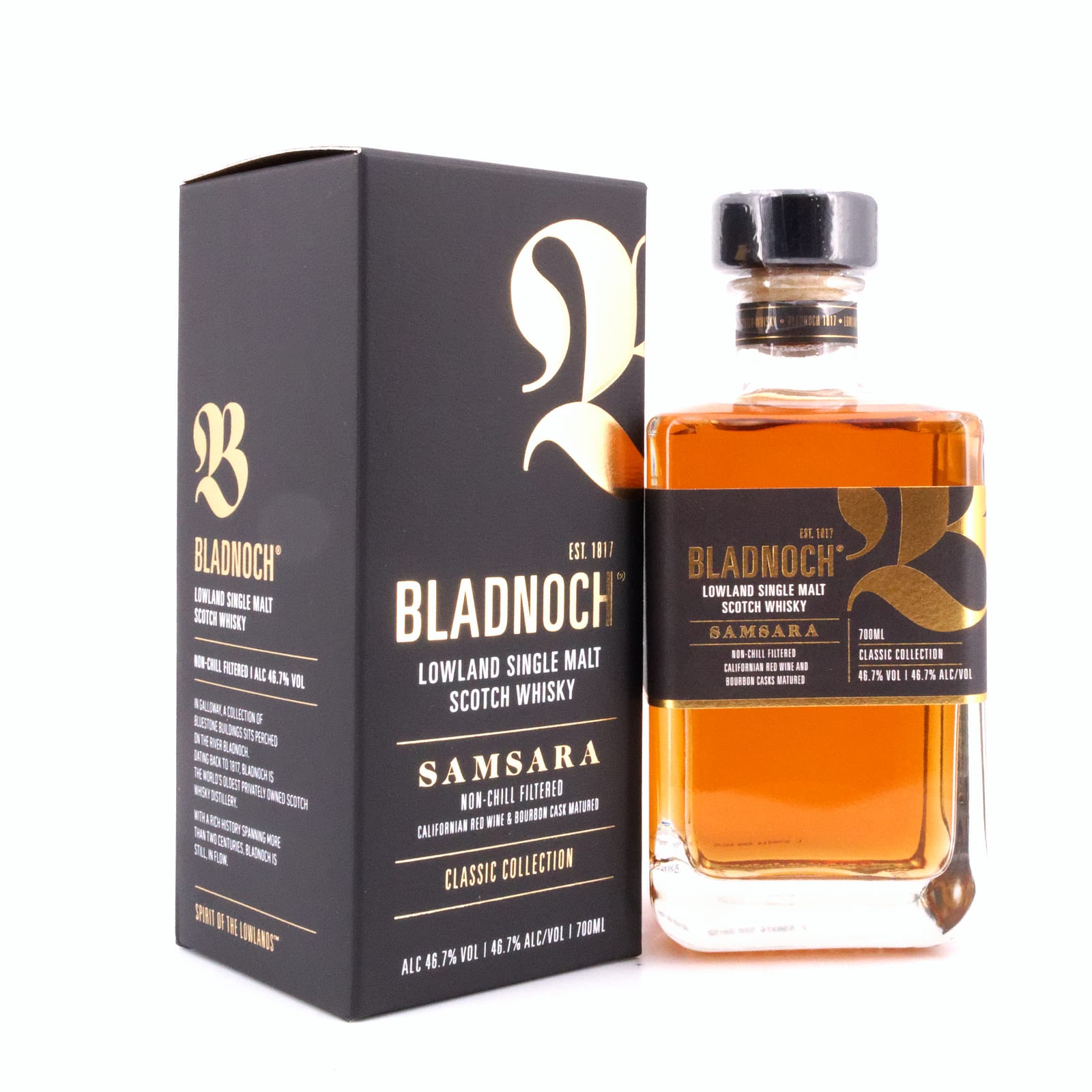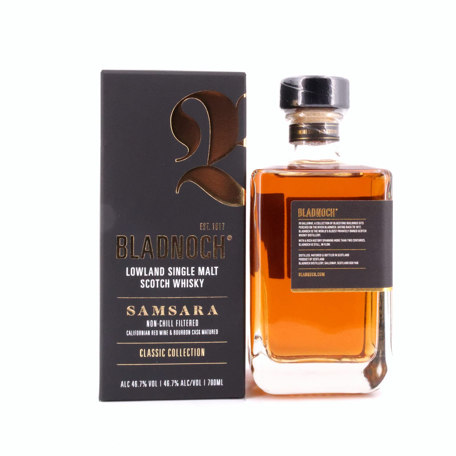 Der „Bladnoch Samsara“ (Samsara bedeutet Wiedergeburt) ist ein achtjähriger Whisky aus dem alten Bestand, gereift in Fässern aus Amerikanischer Eiche (First Fill Bourbon- und First Fill Kalifornische Rotwein-Fässer). Abgefüllt wird nicht kühlfiltriert und ungefärbt mit kräftigen 46,7 Vol% Alkoholgehalt.