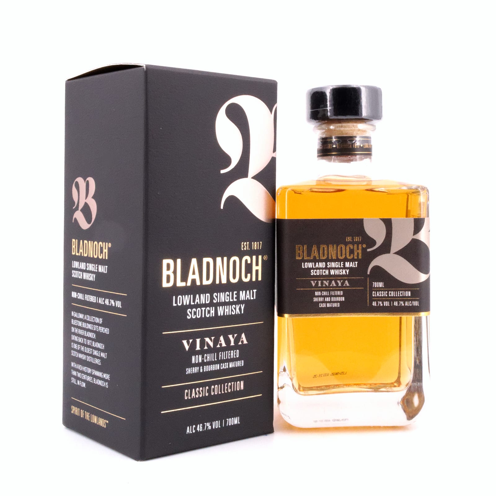 Der „Bladnoch Vinaya“ (Vinaya bedeutet auf Sanskrit so viel wie „Respekt, Dankbarkeit“) ist eine Abfüllung aus dem alten Bestand der Destillerie, gereift in First Fill ex-Bourbon- und First Fill ex-Sherry-Fässern, abgefüllt zu Ehren der Brennerei-Gründer. Auch dieser „Bladnoch Vinaya“ wurde weder kühlfiltriert noch gefärbt und mit kräftigen 46,7 Vol% Alkoholgehalt abgefüllt.