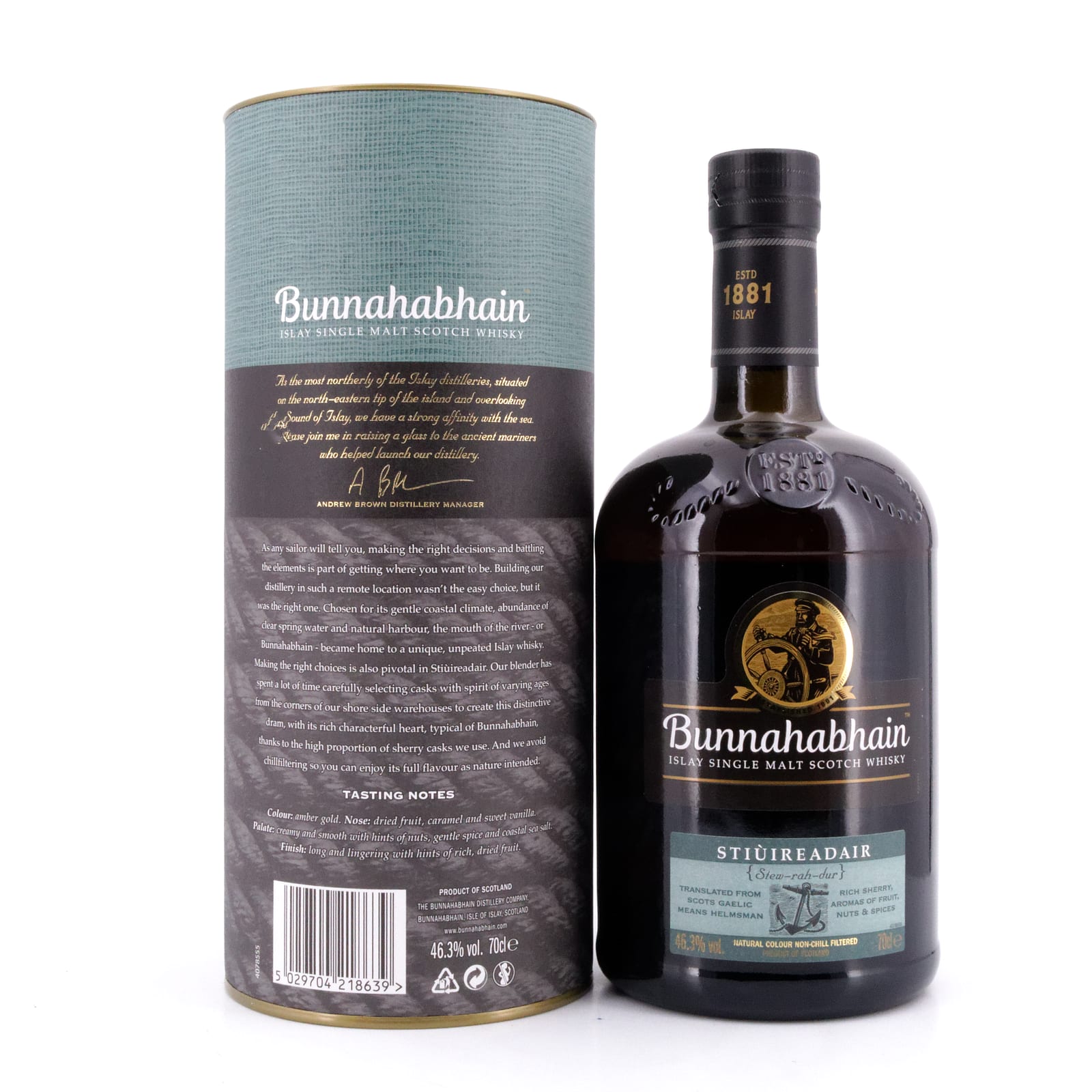 Der Whisky für den „Bunnahabhain Stiùireadair“ (gesprochen Stu-Radhur) reifte in First und Second Fill Sherry-Fässern. Ohne Altersangabe, abgefüllt mit 46,3 Vol% ist er als Einsteiger-Whisky und Alternative für den zwölfjährigen Bunnahabhain konzipiert worden.