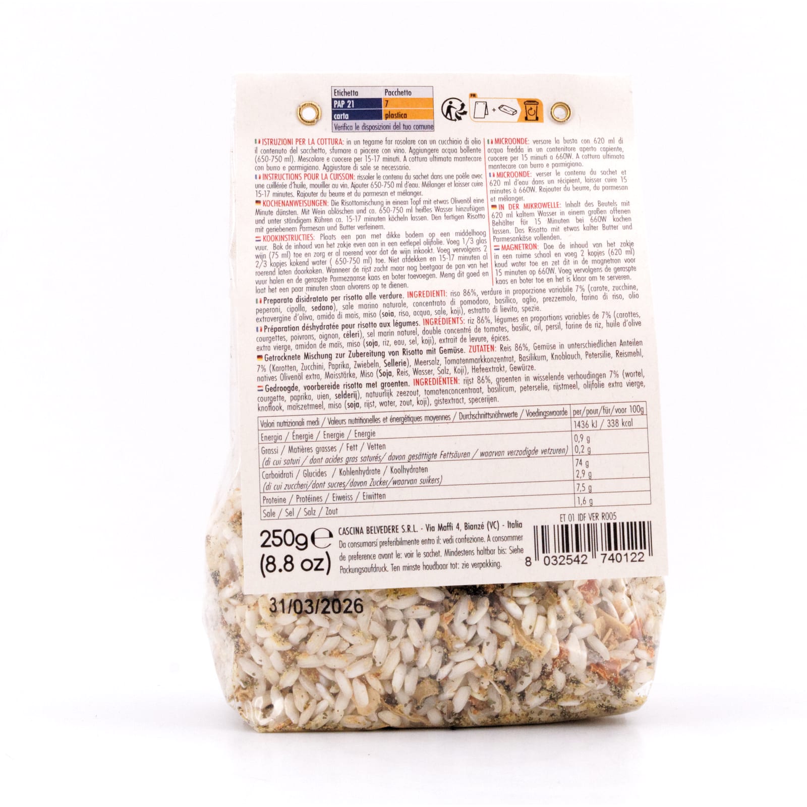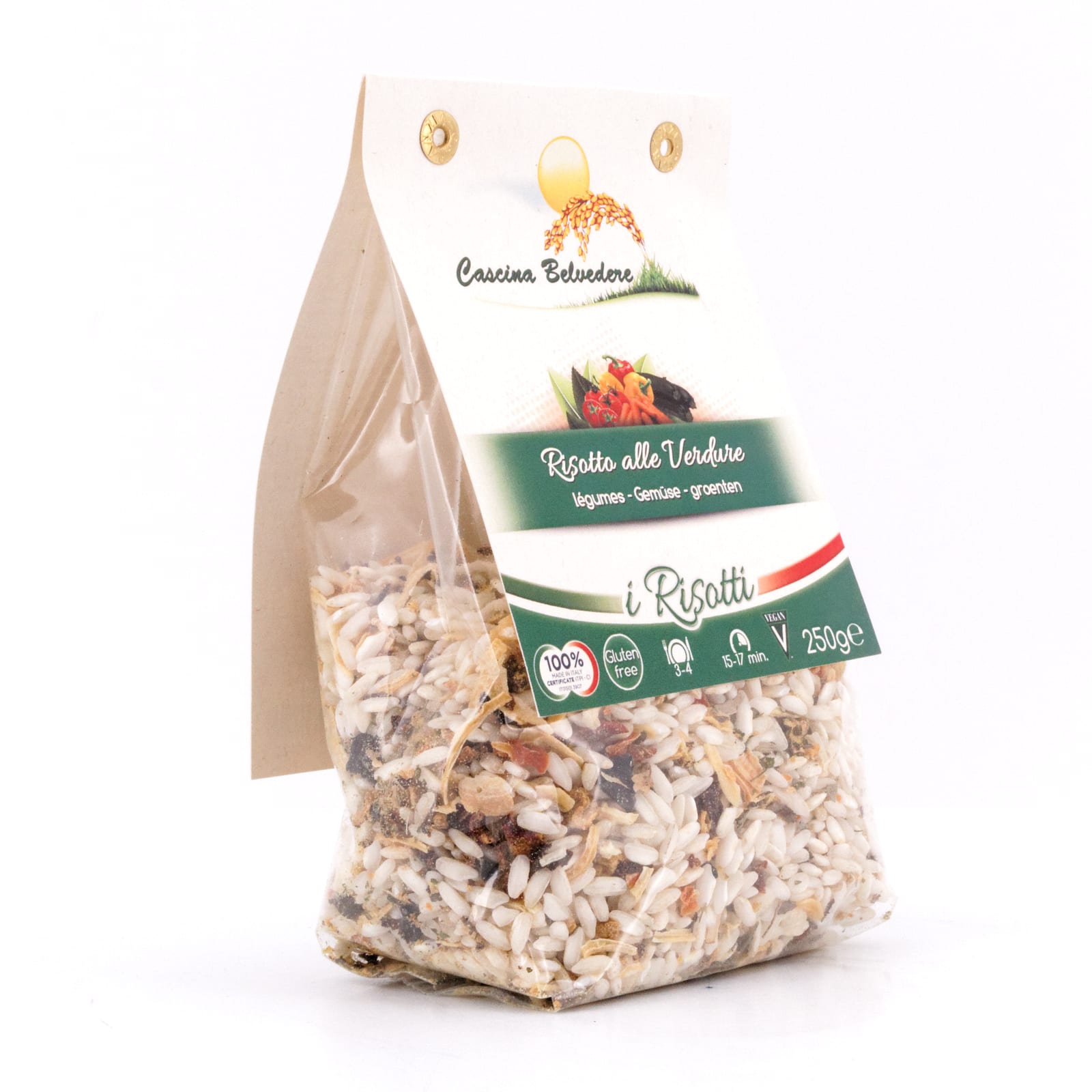 Diese spezielle Risottomischung enthält sorgfältig ausgewählten Carnarolireis, der mit einer reichhaltigen Auswahl an Gemüse wie Karotten, Zucchini, Paprika, Zwiebeln und Sellerie verfeinert wird.