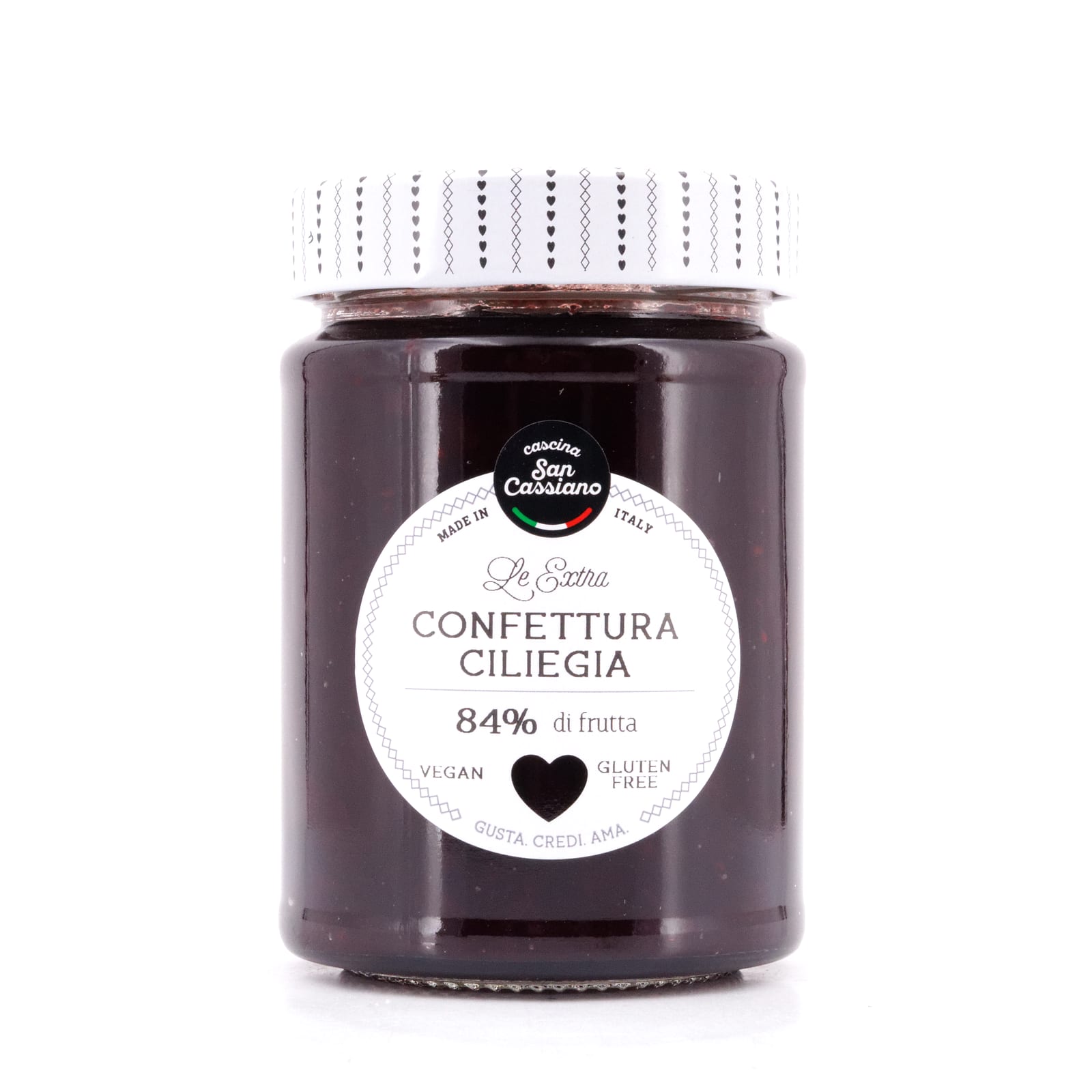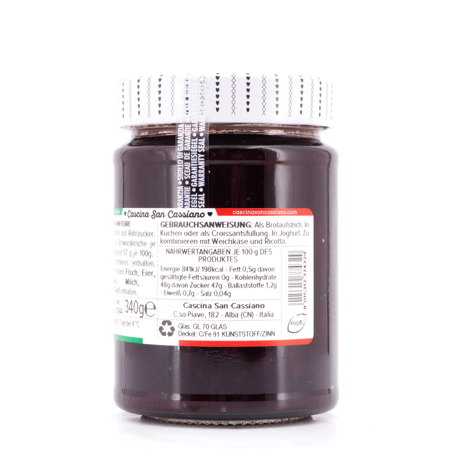 Zutaten: Schwarzkirsche und Rohrzucker. Hergestellt aus 84 g Schwarzkirsche je 100g. Gesamtzucker 57 g je 100 g.