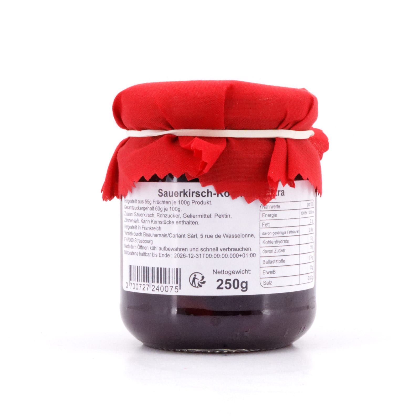 Die „Confiture artisanale Cerise Griotte“ Sauerkirsch-Konfitüre stammt vom französischen Feinkost-Hersteller „Beauharnais-Carlant“ mit Sitz in Straßburg.
