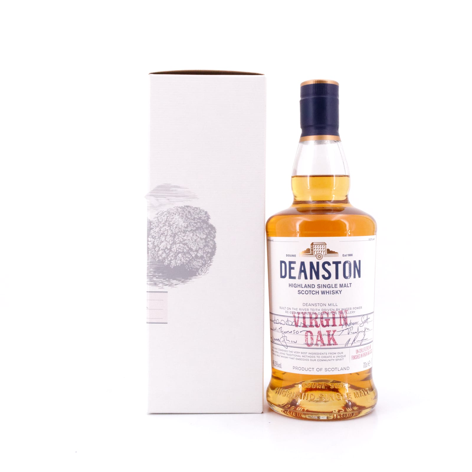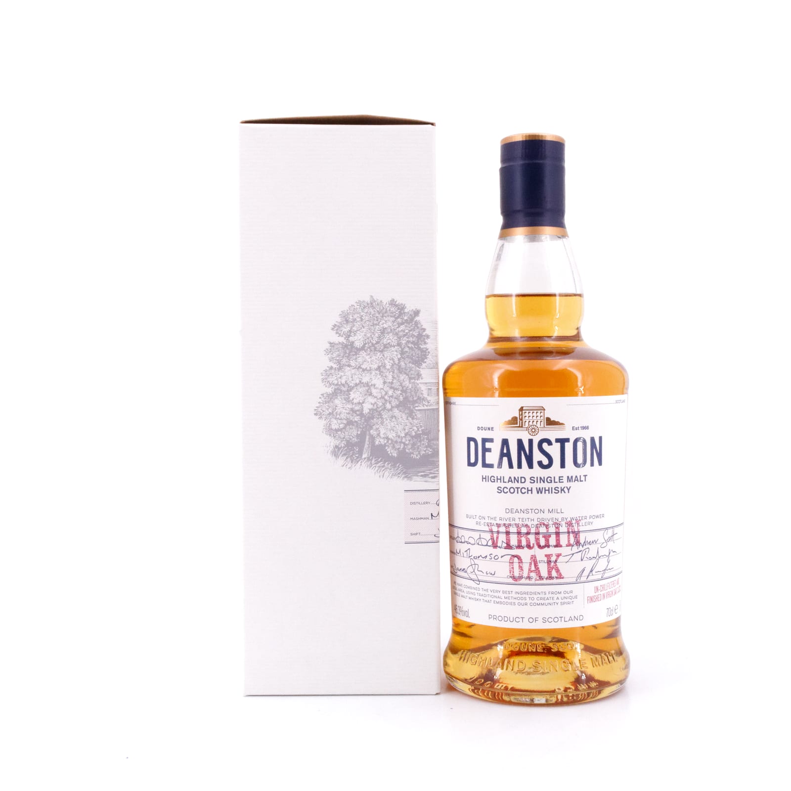 Die Deanston Destillerie gehört zu den Brennereien neueren Datums: 1965 wurde als Tochter der „James Finlay & Co.“ die „Deanston Distillery Ltd.“ gegründet, und man erwarb eine alte Baumwoll-Mühle und Weberei, die im Jahr 1785 von Richard Arkwrigth in der Grafschaft Perth erbaut worden war. Nach kurzer Umbauzeit begann im Oktober 1966 der Brennbetrieb, und 1971 erschien der erste Whisky unter dem Namen „Old Bannockburn“. Im darauffolgenden Jahr bere....