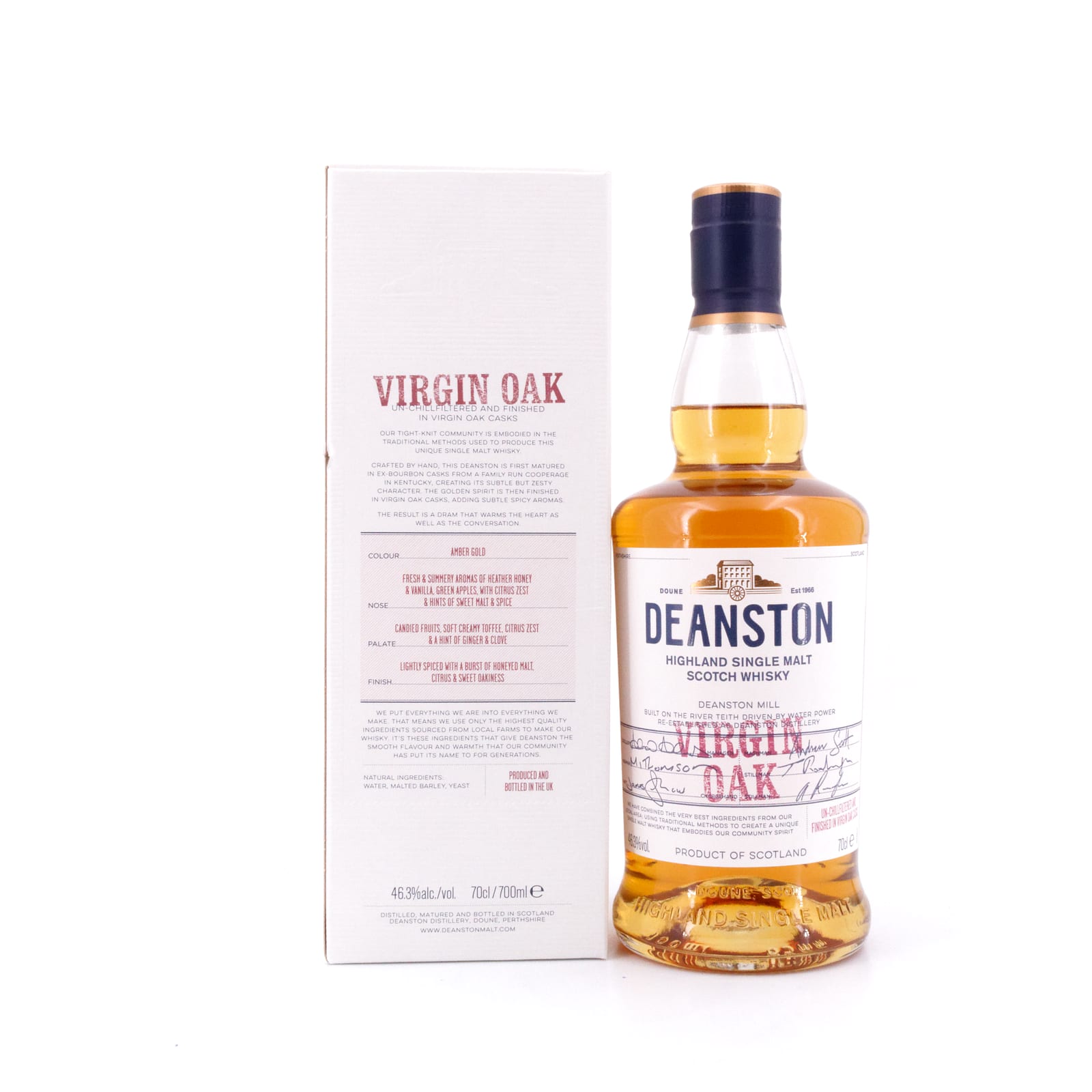 Der Deanston Virgin Oak erhielt ein Finishing in jungfräulichen Fässern aus amerikanischer Weißeiche. Diese Nachreifung verlieh ihm ein angenehmes Duftaroma nach süßem Malz, Vanille und frischen Zitronenschalen. Am Gaumen offenbaren sich Noten von kandierten Früchten die mit Toffee, süßem Heidehonig und Vanille verwoben sind. Dabei deutet das cremige Mundgefühl des Highland Malt auf einen hervorragend abgerundeten Charakter hin. Würzige Elemente, die im mittellangen Abgang hinzu kommen runden das schöne Geschmackserlebnis ab.