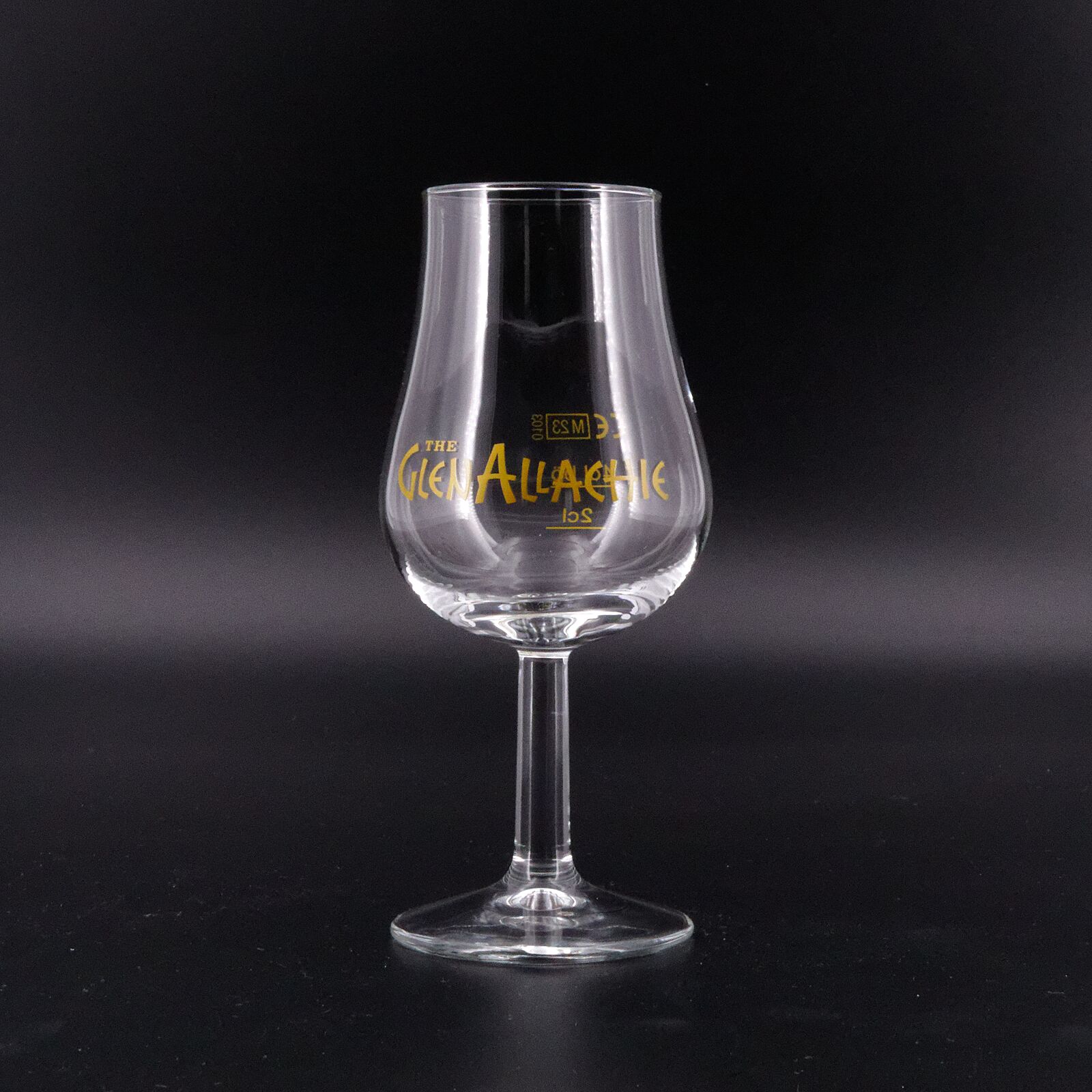 Dieses schlicht-elegante Stielglas mit einem Tulpen-förmigen Kelch und rund 13 cm Höhe reiht sich ein in die Reihe der ganz klassischen Nosing- und Tasting-Gläser, wie sie ganz oft bei Whisky-Verkostungen Verwendung finden. Der Kelch selbst fasst 80 ml und bietet einen angenehm schmalen, Mund-schmeichelnden Trinkrand. Auf dem Bauch außen trägt er auf der einen Seite in der für GlenAllachie typischen Schrift den Namen des Whiskies aus der Destillerie - The GlenAllachie. Gegenüber finden sich zwei Eichstriche, einmal bei 2 und einmal bei 4 cl.