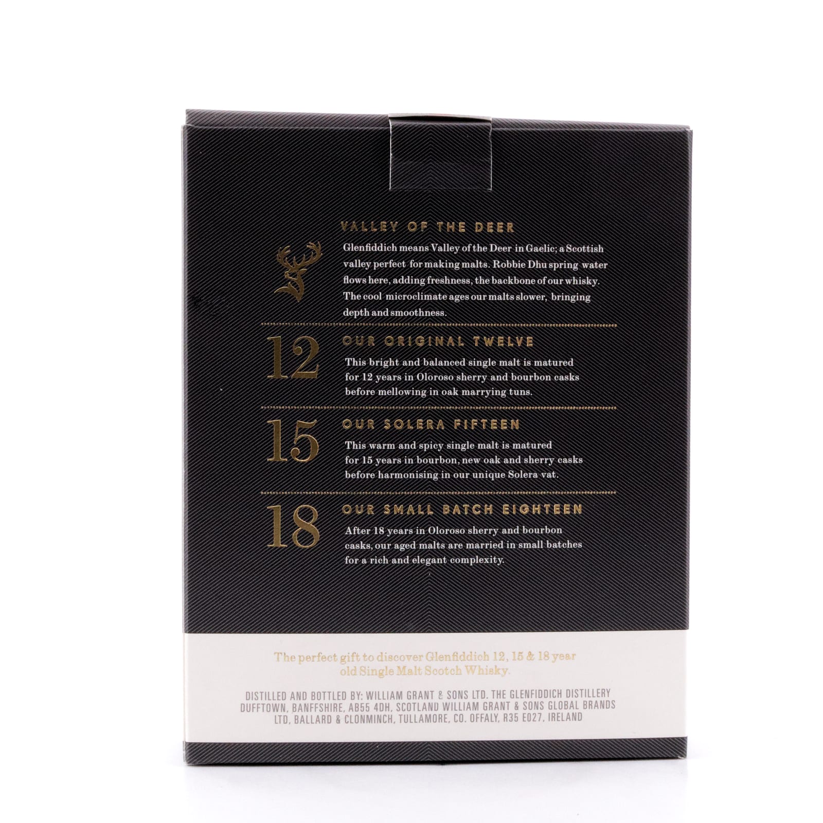 Glenfiddich, eine der bekanntesten Destillerien aus Speyside, Schottland, wurde 1886 von William Grant gegründet und ist weltweit für seine Single Malt Whiskys berühmt. Dieses Tasting Pack bietet eine spannende Verkostung der drei beliebten Whiskys aus dem Kernsortiment: Glenfiddich 12, 15 und 18 Jahre.