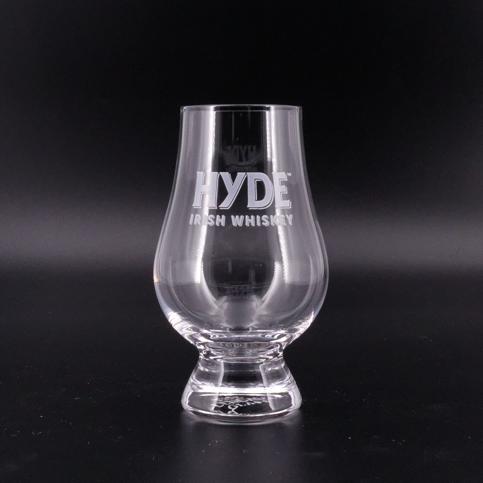 Das klassisch schlichte und elegante Whisky-Glas in der bekannten „Glencairn“-Form trägt eingraviert auf dem Bauch außen die Aufschrift Hyde Whiskey der unabhängigen Abfüller Alan und Conor Hyde mit ihren „Hibernia Distillers“.