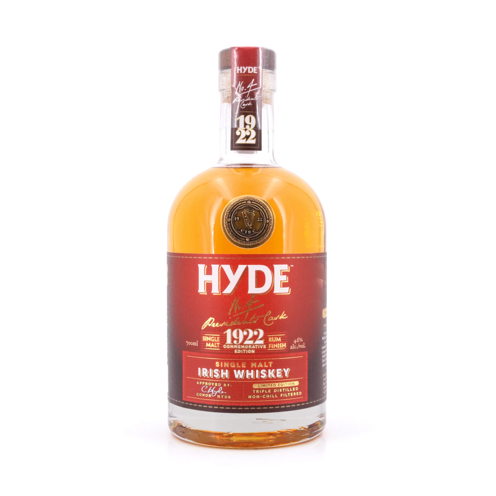 Der „Hyde No. 6 President‘s Reserve Black Label Double Wood“ ist ein Blended Whiskey aus Irland, genauer von „Hyde Whiskey“ in Skibbereen in West Cork. Dahinter stehen als unabhängige Abfüller die Brüder Alan und Conor Hyde mit ihren „Hibernia Distillers“. Zunächst in ex-Bourbon-Fässern gelagert, durfte dieser Single Malt in ehemaligen Dark Rum-Fässern der Insel Barbados nachreifen. Benannt ist diese Abfüllung nach Douglas Hyde, dem ersten Präsidenten der Republik Irland, die Jahreszahl 1922 markiert das Jahr der Unabhängigkeit Irlands.