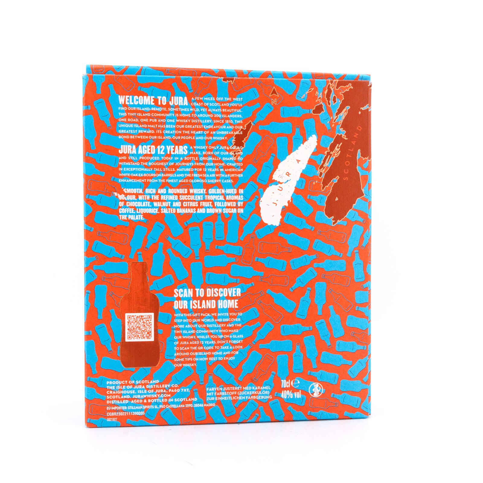 Die Isle of Jura Destillerie wie sie heute auf der Insel steht, wurde Mitte der 1960er Jahre fertiggestellt, wobei Archibald Campbell nachweislich bereits 1810 an gleicher Stelle Whisky gebrannt hatte. Heute gehört die Brennerei zur „Alliance Global Group“, einem international operierenden Getränke-Konzern. In den vergangenen zwei Jahren hat man das Portfolio der Destillerie im Zuge einer Neuausrichtung grundlegend überarbeitet. Nachdem im Herbst 2017 bereits die vier neuen Whiskies für den Reisehandel auf den Markt gekommen waren, folgten im Frühjahr 2018 die fünf überarbeiteten Abfüllungen des Standardsortiments, darunter neben dem „Jura Journey“, dem „Jura 10 Year Old und dem „Jura Seven Wood“ auch eine Neuauflage des zwölfjährigen Isle of Jura (40 Vol%). Gelagert wurde dieser neue „Jura 12 Year Old“ in Fässern aus amerikanischem Eichenholz und ehemaligen Oloroso Sherry Butts.