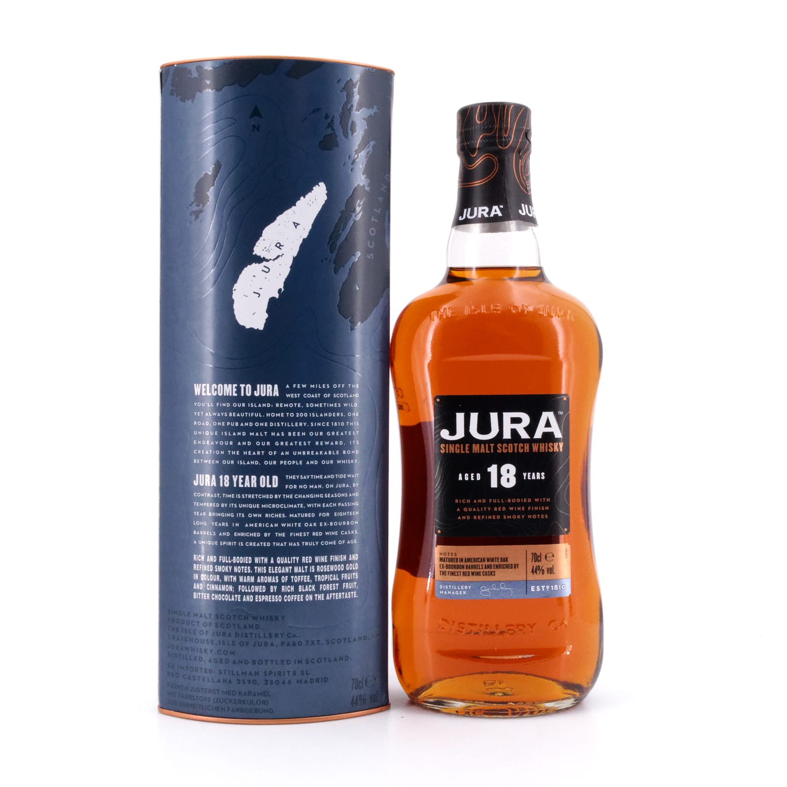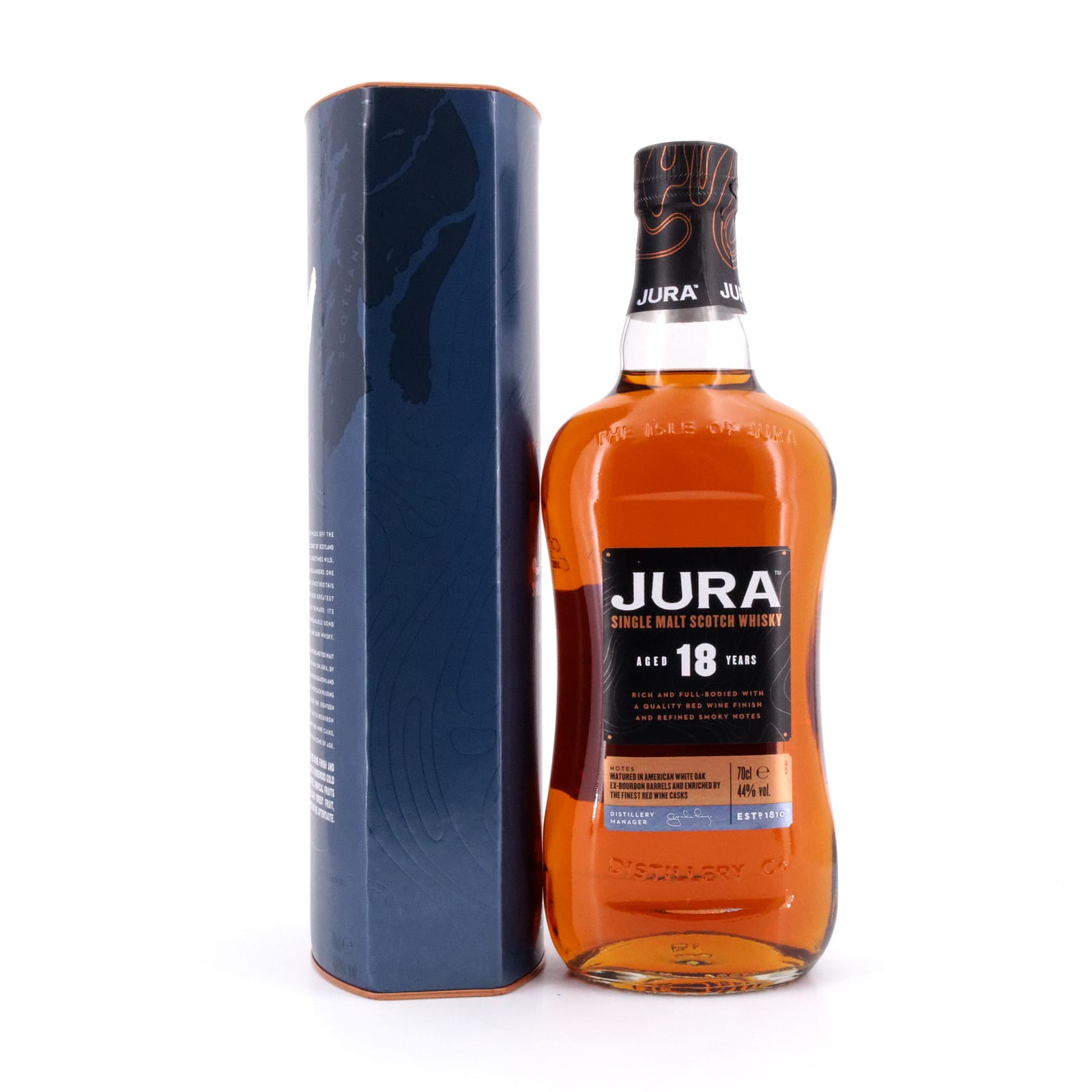 Dieser 18 Jahre alte „Isle of Jura“ war ursprünglich für den Reisehandel konzipiert. Nach einer Lagerung in ehemaligen Small Batch Bourbon-Fässern aus Amerikanischem Eichenholz durfte dieser ganz besondere Whisky noch in ehemaligen Premier Cru-Bordeaux Rotwein-Fässern nachreifen. Abgefüllt wurde der „Jura 18 Jahre“ in Trinkstärke mit 44,0 Vol% Alkoholgehalt.