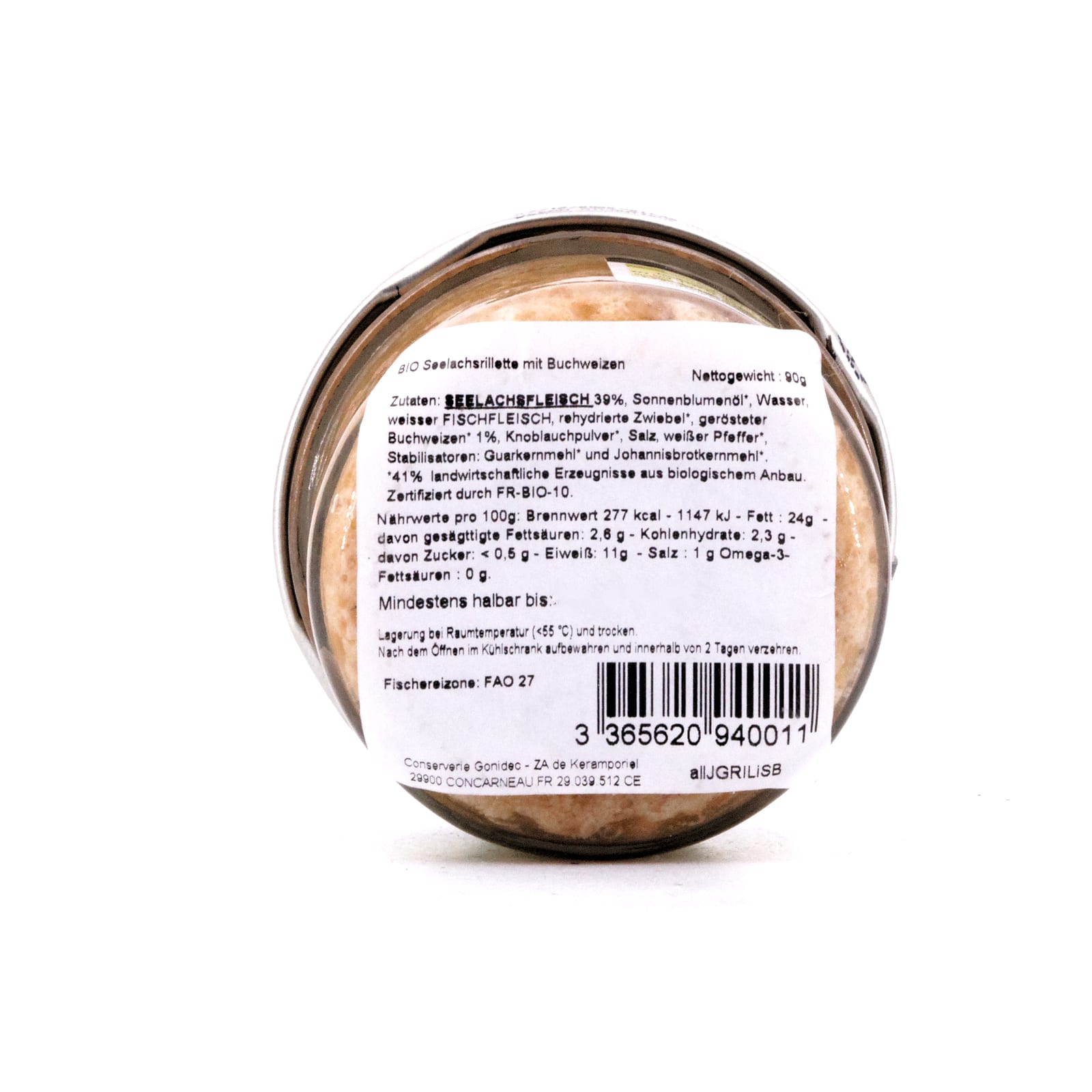 Zutaten: SEELACHSFLEISCH 39%, Sonnenblumenöl*, Wasser, weißes FISCHFLEISCH, rehydrierte Zwiebel*, gerösteter Buchweizen* 1%, Knoblauchpulver*, Salz, weißer Pfeffer*, Stabilisatoren: Guarkernmehl* und Johannisbrotkernmehl*.