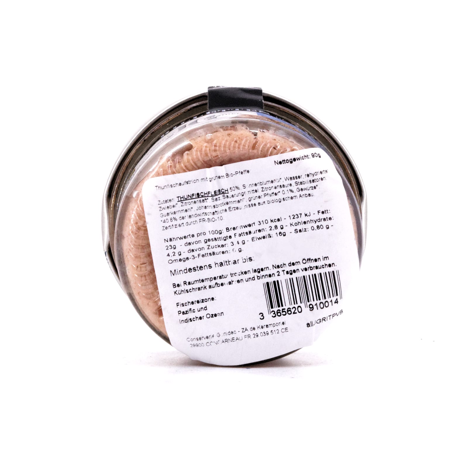 Zutaten: THUNFISCHFLEISCH 50%, Sonnenblumenöl*, Wasser, rehydrierte Zwiebel*, Zitronensaft*, Salz, Säuerungsmittel: Zitronensäure, Stabilisatoren: Guarkernmehl* und Johannisbrotkernmehl*, grüner Pfeffer* 0,1%, Gewürze*.
