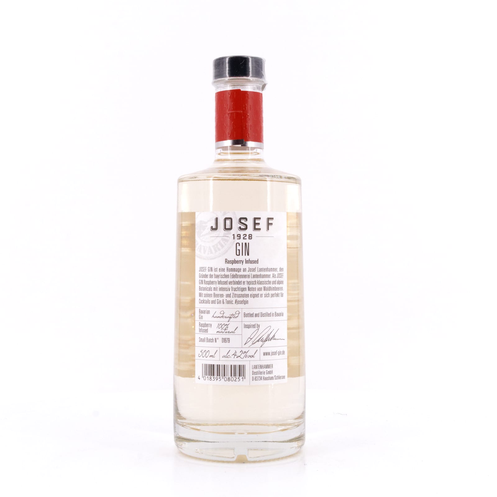 Der „Josef Bavarian Gin“ ist die Hommage an Josef Lantenhammer, den Gründer der Destillerie Lantenhammer im oberbayerischen Hausham am Schliersee, heute bekannt weit über die Grenzen Bayerns hinaus für seinen „Slyrs Whisky“. Begonnen hat das Unternehmen als Enzianbrennerei, und auch ein Wacholdergeist fand sich damals bereits im Portfolio. Nach den alten Rezepten hat nun die dritte Generation der Lantenhammers diesen „Wacholdergeist“ neu aufgelegt und zu Ehren seines Erfinders „Josef Bavarian Gin“ getauft. Es gibt ihn in vier verschiedenen Varianten, eine davon ist der zart rosafarbene „Josef Bavarian Gin Raspberry Infused“. Basis dieses bayerischen Gins ist Alkohol aus der Kartoffelsorte „Linda“, dem eine Reihe Kräuter wie die bayerischen Heublumenblüten (Flores graminis), Holunderbeeren (Sambucus), Hopfendolden (Humulus lupulus), Fenchelsamen (Foeniculum), Wacholderbeeren (Juniperus), Zitronen- (Citrus x limon), Orangenschalen (Citrus x sinensis L.) und eben Himbeeren (Rubus idaeus) zugesetzt sind. Abgefüllt wird mit kräftigen 42 Vol% Alkoholgehalt.