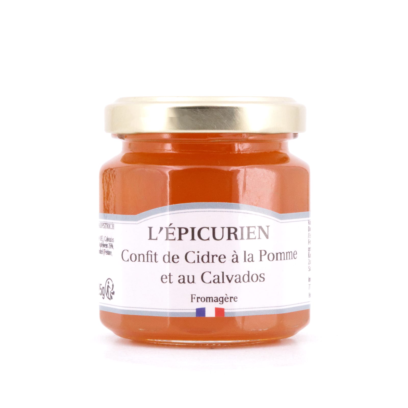 Eine ganz wunderbare Zusammenstellung ist ihre Mischung aus Apfel, Cidre und Calvados, der „Confit de Cidre à la Pomme et au Calvados“. Zusammengestellt eigens als eleganter Begleiter von Käse ist diese Mischung weniger süß als die üblichen Marmeladen und Konfitüren „L’Épicuriens“. Im Hinterkopf hatte man bei der Kreation dieses Fruchtaufstrichs reifen Camembert, bzw. den kräftigen Rotschmierkäse Pont L'Evêque aus der Normandie. Und so passt dieser „Confit de Cidre à la Pomme et au Calvados“ mit seiner frischen Fruchtigkeit und den fein-aromatischen Cidre- und Calvados-Noten wunderbar zu den intensiven, satten Aromen reifer Weichkäse.