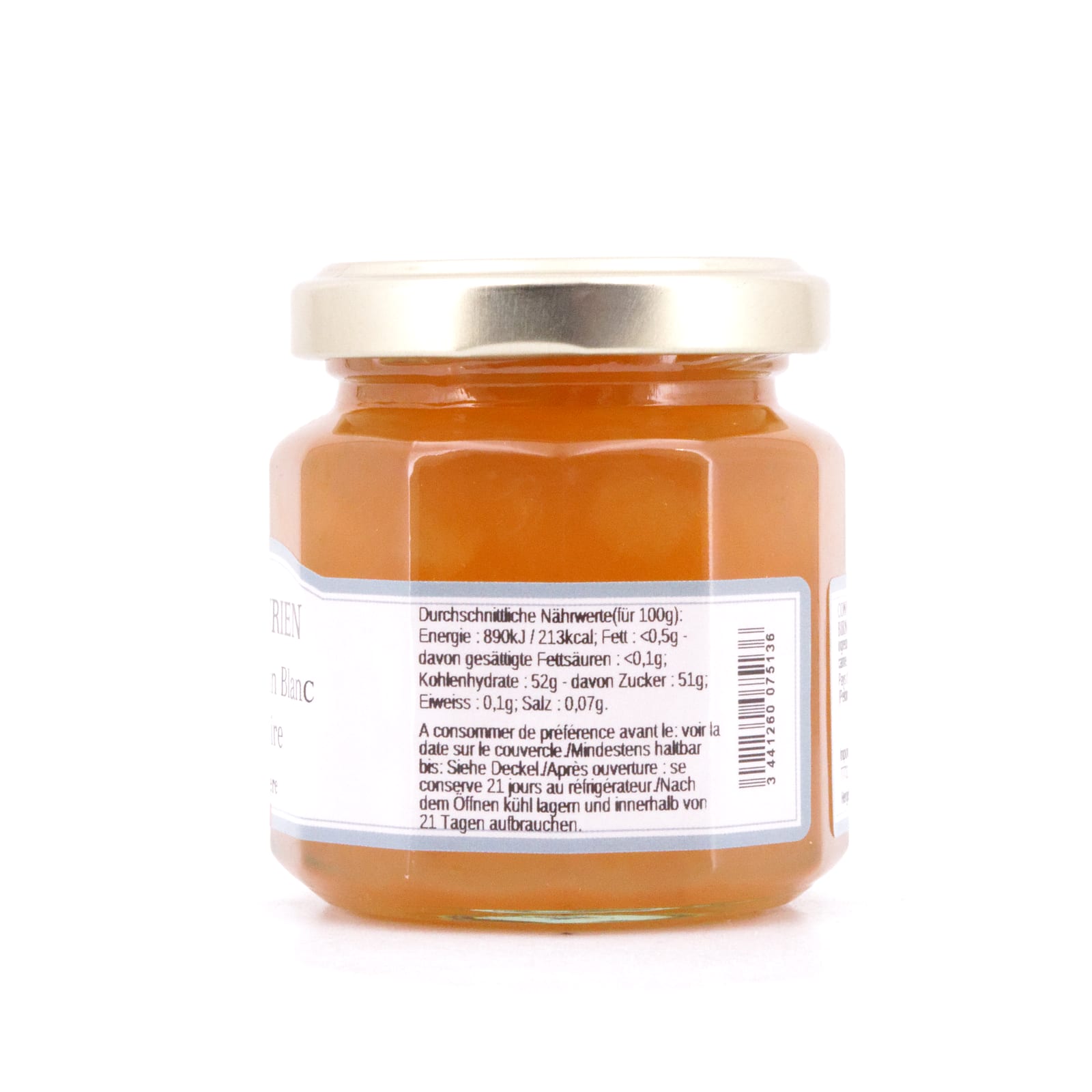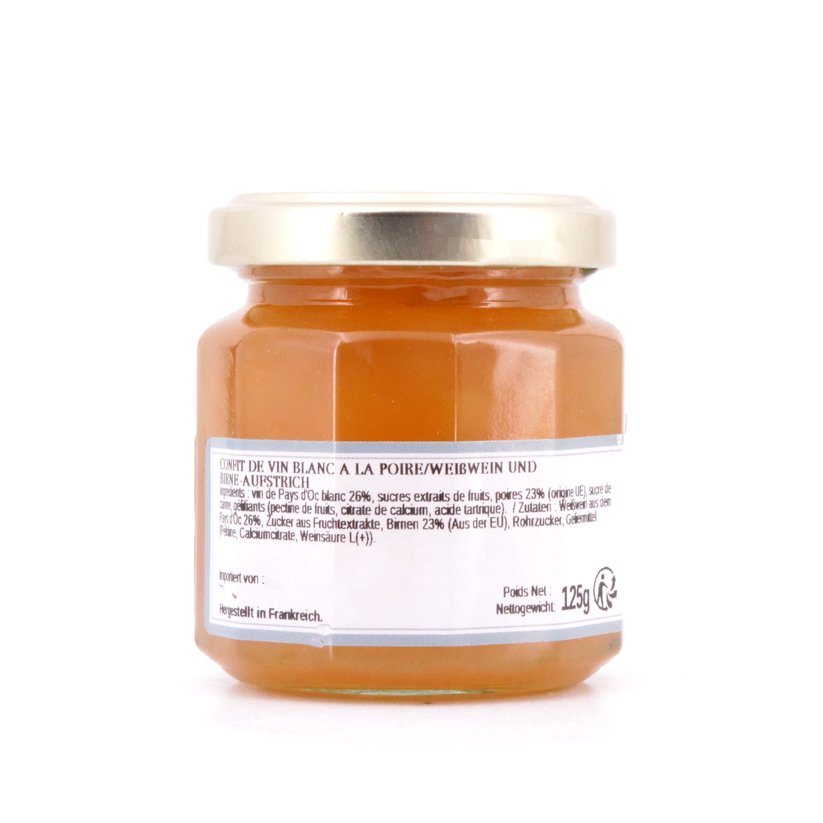 Weißwein aus dem Pays d`Oc 26%, Zucker aus Fruchtextrakte, Birnen 23%, Rohrzucker, Geliermittel (Pektine, Calciumcitrate, Weinsäure L( )). Enthält Alkohol.