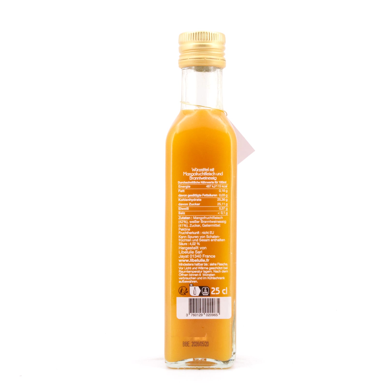 Ihr „Libeluile Mangofruchtessig“ fällt zuallererst auf durch seine leuchtend sonnengoldene Farbe, die aus der Kombination von feinem Weißweinessig und süßen, reifen Mangos entsteht.