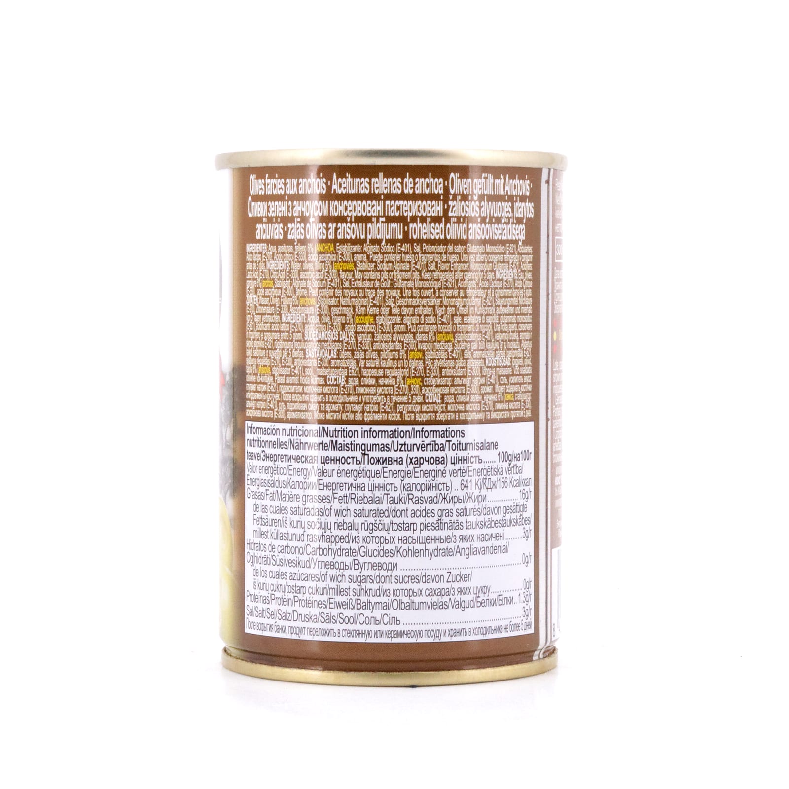Wasser, Oliven, Füllung 6% (ANCHOVIS, Stabilisierungsmittel: E-401), Salz, Geschmackverstarker: E-621, Säuerungsmittel: E-270 und E-330, Antioxydans: E-300.