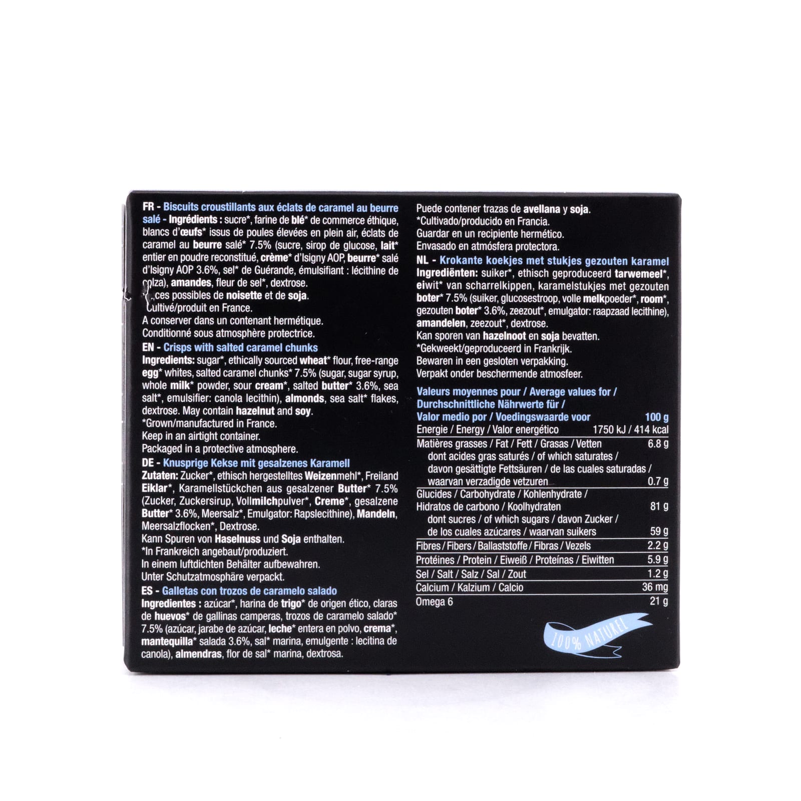 Zutaten: Zucker*, ethisch hergestelltes Weizenmehl*, Freiland Eiklar*, Karamellstückchen aus gesalzener Butter* 7,5% (Zucker, Zuckersirup, Vollmilchpulver*, Creme*, gesalzene Butter* 3,6%, Meersalz*, Emulgator: Rapslecithine), Mandeln, Meersalzflocken*, Dextrose.