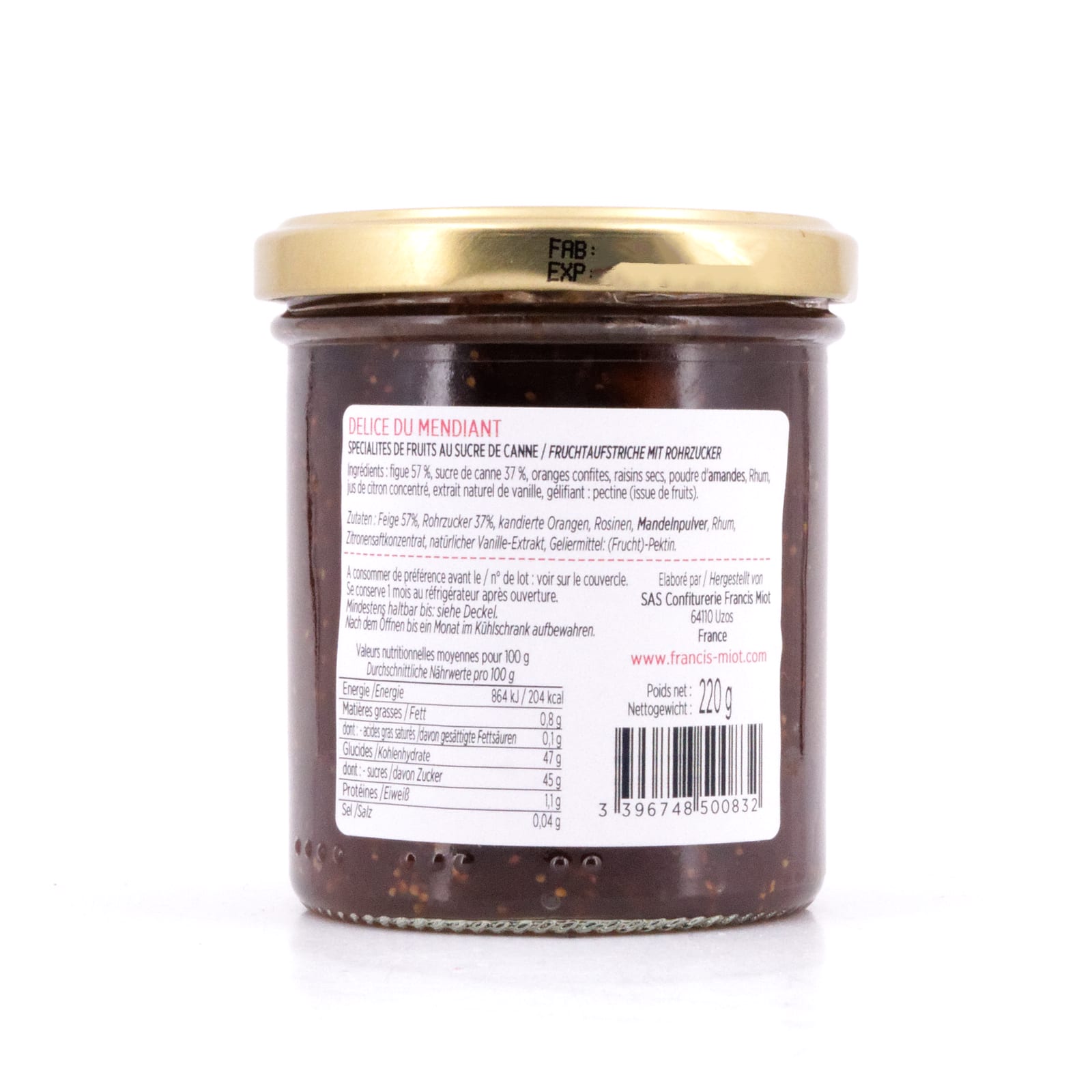 Für den Fruchtaufstrich „Délice du Mendiant“ zu Deutsch so viel wie Gaumenschmaus für Vagabunden, wurden mit getrocknete Feigen (Ficus), Dörr-Aprikosen (Prunus armeniaca) und Rosinen die klassischen Früchte der Provence kombiniert, mit einem Schuss Rum und Rohrzucker zu einer süßen Versuchung eingekocht, die ihre Wurzeln in einer alten provenzalischen Tradition hat. Denn alte provenzalische Sitte sieht vor, dass Bettler, Vagabunden und fahrendes Volk frische oder getrocknete Früchte zu essen bekommen, dazu heißen Wein, um sich aufzuwärmen.