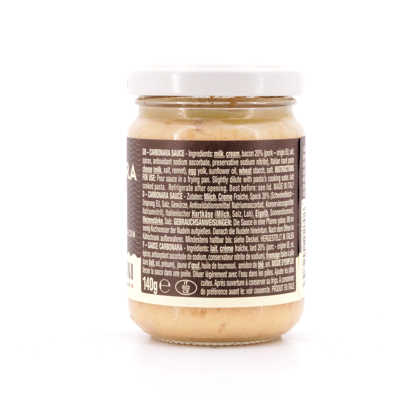 MILCH, CREME Fraiche, Speck 20% (Schweinefleisch – Ursprung EU, Salz, Gewürze, Antioxidationsmittel Natriumascorbat, Konservierungsmittel Natriumnitrit), Italienischer HARTKÄSE (MILCH, Salz, Lab), EIGELB, Sonnenblumenöl, WEIZENSTÄRKE, Salz.