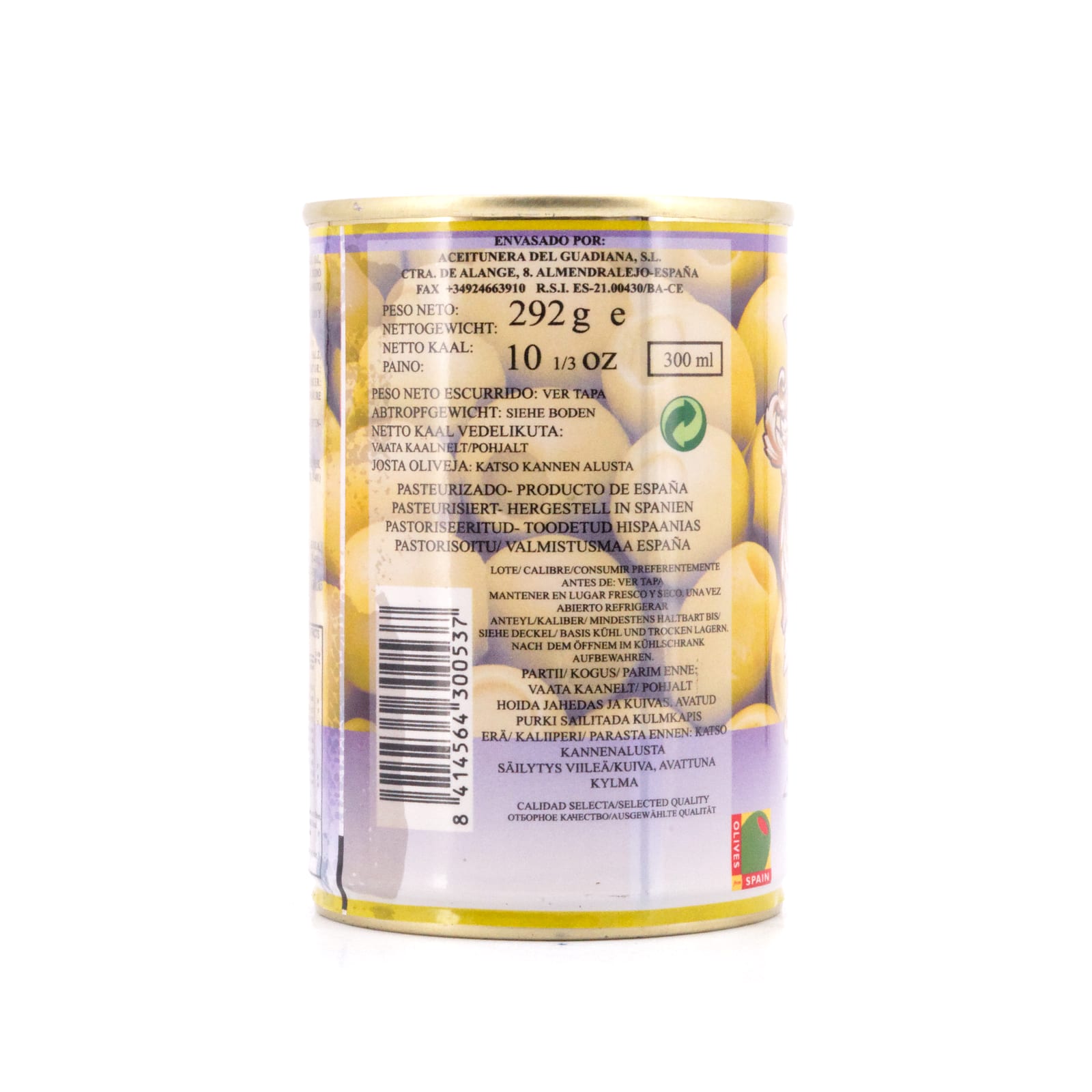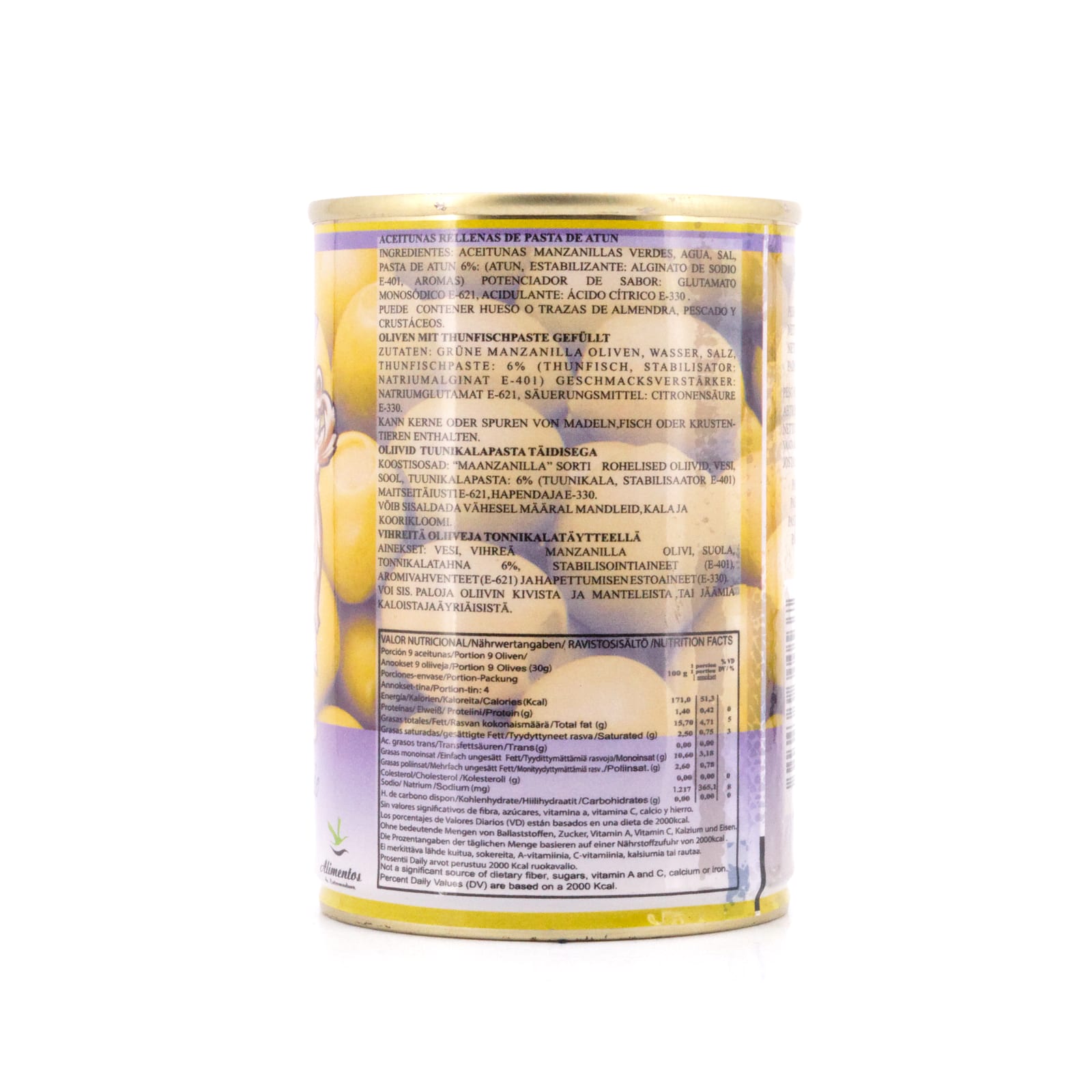Zutaten: Grüne Manzanilla Oliven, Wasser, Salz, Thunfischpaste: 6% (Thunfisch, Stabilisator: Natriumalginat e-401), Geschmacksverstärker: Natriumglutamat E621, Säuerungsmittel: Zitronensäure E-330.