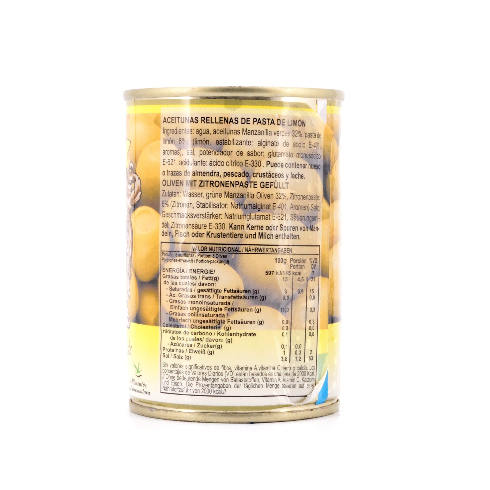 Zutaten: Grüne Manzanilla Oliven 32%, Wasser, Zitronenpaste: 6% (Zitronen, Stabilisator: Natriumalginat E-401, Aromen), Salz, Geschmacksverstärker: Natriumglutamat E-621, Säuerungsmittel: Zitronensäure E-330.