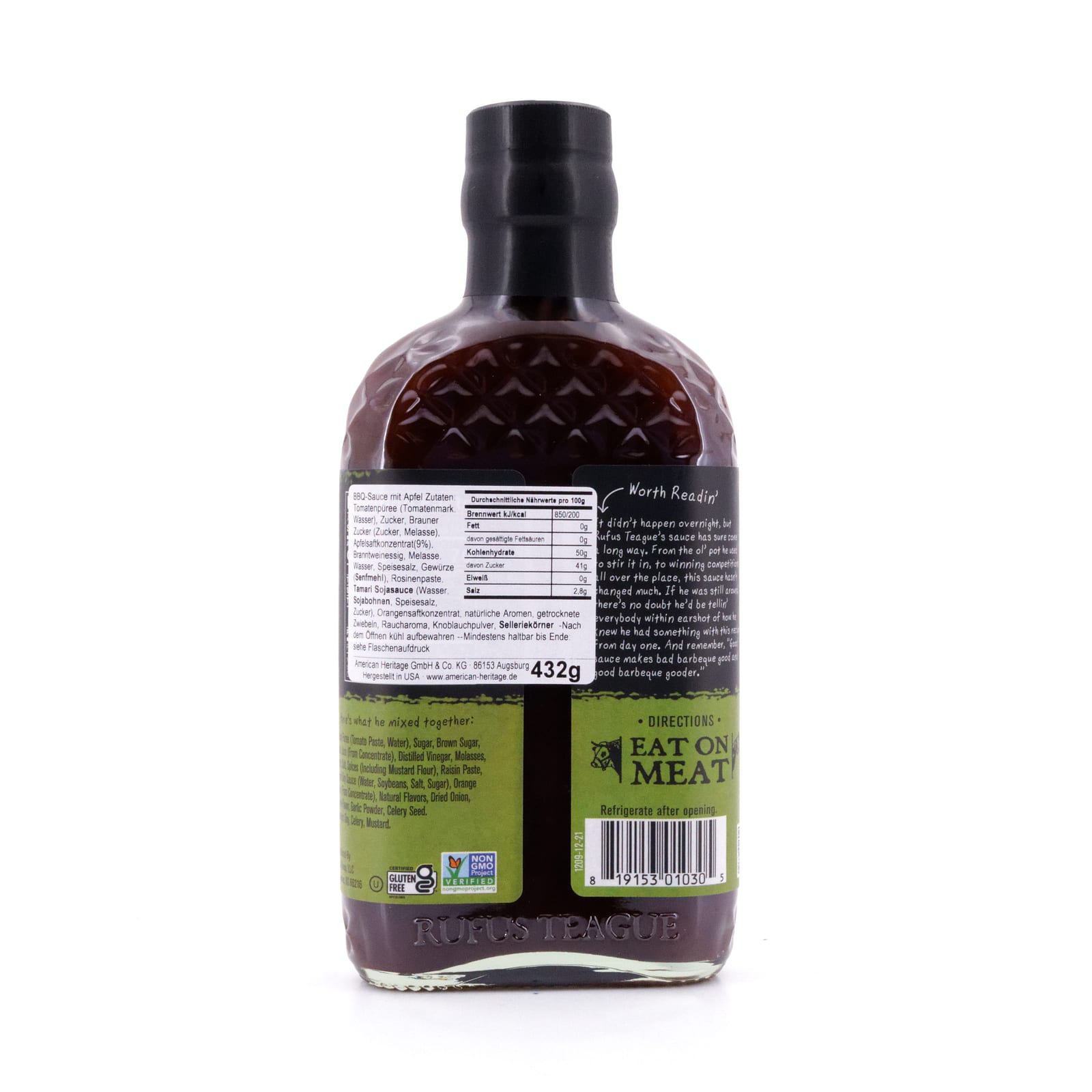 Zutaten: Tomatenpüree (Tomatenmark, Wasser), Zucker, Brauner Zucker (Zucker, Melasse), Apfelsaftkonzentrat(9%), Branntweinessig, Melasse, Wasser, Speisesalz, Gewürze (Senfmehl), Rosinenpaste, Tamari Sojasauce (Wasser, Sojabohnen, Speisesalz, Zucker), Orangensaftkonzentrat, natürliche Aromen, getrocknete Zwiebeln, Raucharoma, Knoblauchpulver, Selleriekörner.