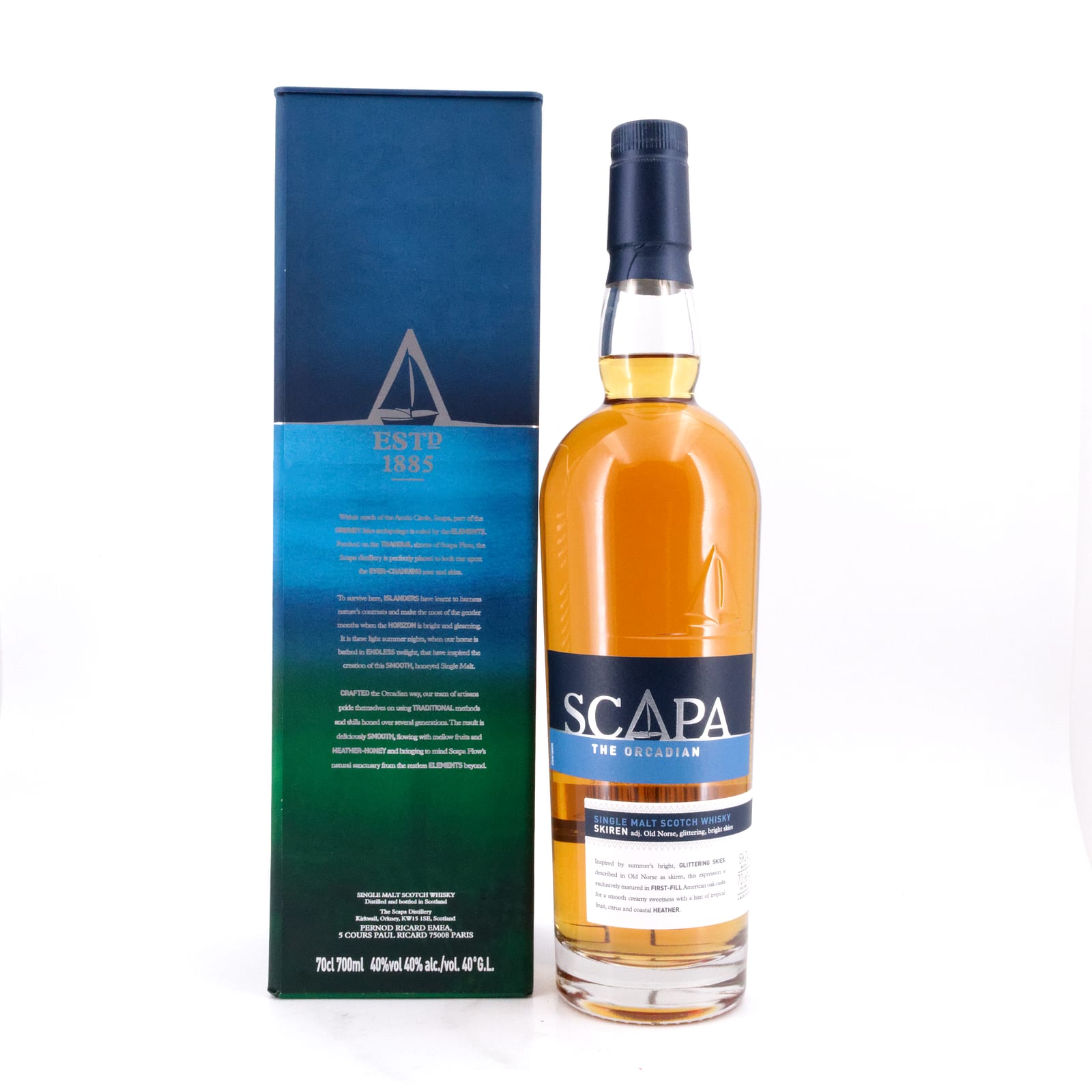 Gegründet 1885 liegt die Scapa Destillerie auf der Hauptinsel Orkney an den Küsten des Scapa Flow in der Nähe von Kirkwall, etwa eine Meile südlich von Highland Park. In den 1950er Jahren wurde Scapa an Hiram Walker & Sons Ltd verkauft und umfänglich renoviert. Seit 1959 benutzt man eine sog. „Lomond Wash Still“, eine Mischform aus Brennkessel und Brennsäule, mit einer zylindrischen Form und beweglichen Kupferplatten für die Regulierung des Rückflusses. Wegen ihrer aufwendigen Reinigung findet diese Art Brennblase heute nur noch in Scapa Verwendung, allerdings ohne die Kupferplatten im Inneren. Zwischen1994 und 2004 legte man die Brennerei still, und nur von Zeit zu Zeit nahm eine Handvoll Arbeiter aus der nahegelegenen Highland Park Brennerei Scapa zeitweise in Betrieb. Im Gegenzug dazu durfte man Scapas Lagerhäuser nutzen. Seit Ende 2004 ist die Scapa Brennerei wieder in Betrieb, wobei 2005 noch einmal umfassend renoviert wurde, diesmal unter der Schirmherrschaft der Chivas Brothers, und damit Pernod Ricard.