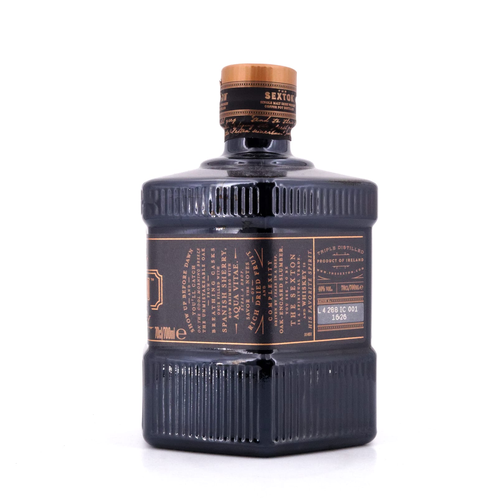Der „Sexton Single Malt“ stammt aus einer der ältesten Destillerien Irlands, genauer aus der Bushmills Brennerei in der Grafschaft Antrim ganz oben an der Nordküste Irlands. Master Blenderin Alex Thomas kreierte diesen Single Malt – und zwar Inhalt wie auch die sechseckige Flasche mit dem eindrucksvollen Logo. Die Flasche soll an die Basaltformationen des Giant’s Causeway ganz in der Nähe der Brennerei an der Nordküste Irlands erinnern, das Logo ist inspiriert vom Sexton, einem Küster oder Mesner, der in früheren Zeiten auch als Totengräber arbeitete.