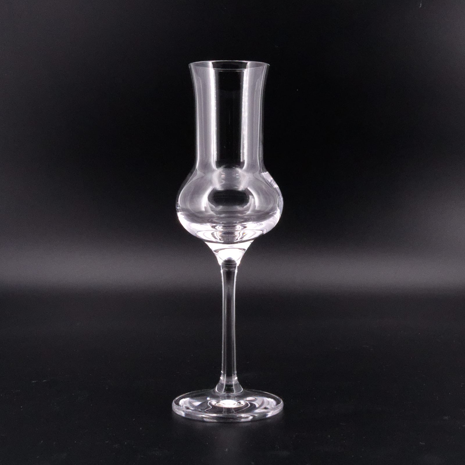 Ein Stielglas, gut 17 cm hoch, der charakteristisch geformte, sich nach oben verjüngende Trinkbecher mit 4 cm Durchmesser ruht auf dem langen, schlanken Stiel. Sein Trinkrand ist rund und angenehm schmal. Der weite Bauch des Glases gibt dem Grappa die Möglichkeit, sich mit viel Sauerstoff-Kontakt voll zu entfalten, das sich Kamin-artig nach oben verjüngende Glas bündelt diese freiwerdenden Aromen und lässt das Bouquet des Trester-Brandes über dem Trinkrand voll zur Geltung kommen.