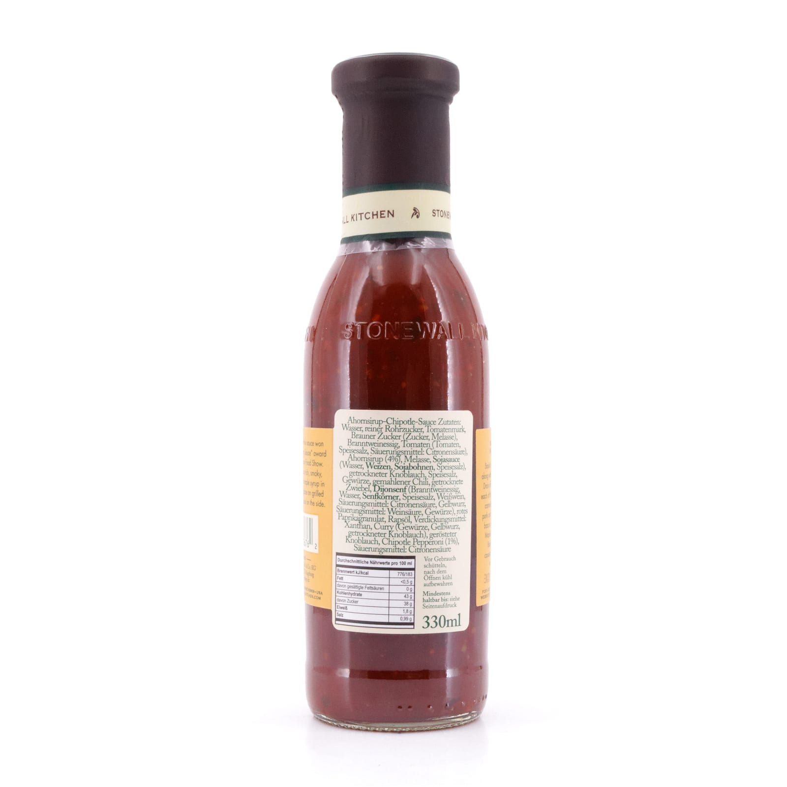Zutaten: Wasser, reiner Rohrzucker, Tomatenmark, Brauner Zucker (Zucker, Melasse), Branntweinessig, Tomaten (Tomaten, Speisesalz, Säuerungsmittel: Citronensäure), Ahornsirup(4%), Melasse, Sojasauce (Wasser, Weizen, Sojabohnen, Speisesalz), getrockneter Knoblauch, Speisesalz, Gewürze, gemahlener Chili, getrocknete Zwiebeln, Dijonsenf (Branntweinessig, Wasser, Senfkörner, Speisesalz, Weißwein, Säuerungsmittel: Citronensäure, Gelbwurz, Säuerungsmittel: Weinsäure, Gewürze), rotes Paprikagranulat, Rapsöl, Verdickungsmittel: Xanthan, Curry (Gewürze, Gelbwurz, getrockneter Knoblauch), gerösteter Knoblauch, Chipotle Pepperoni(1%), Säuerungsmittel: Citronensäure.