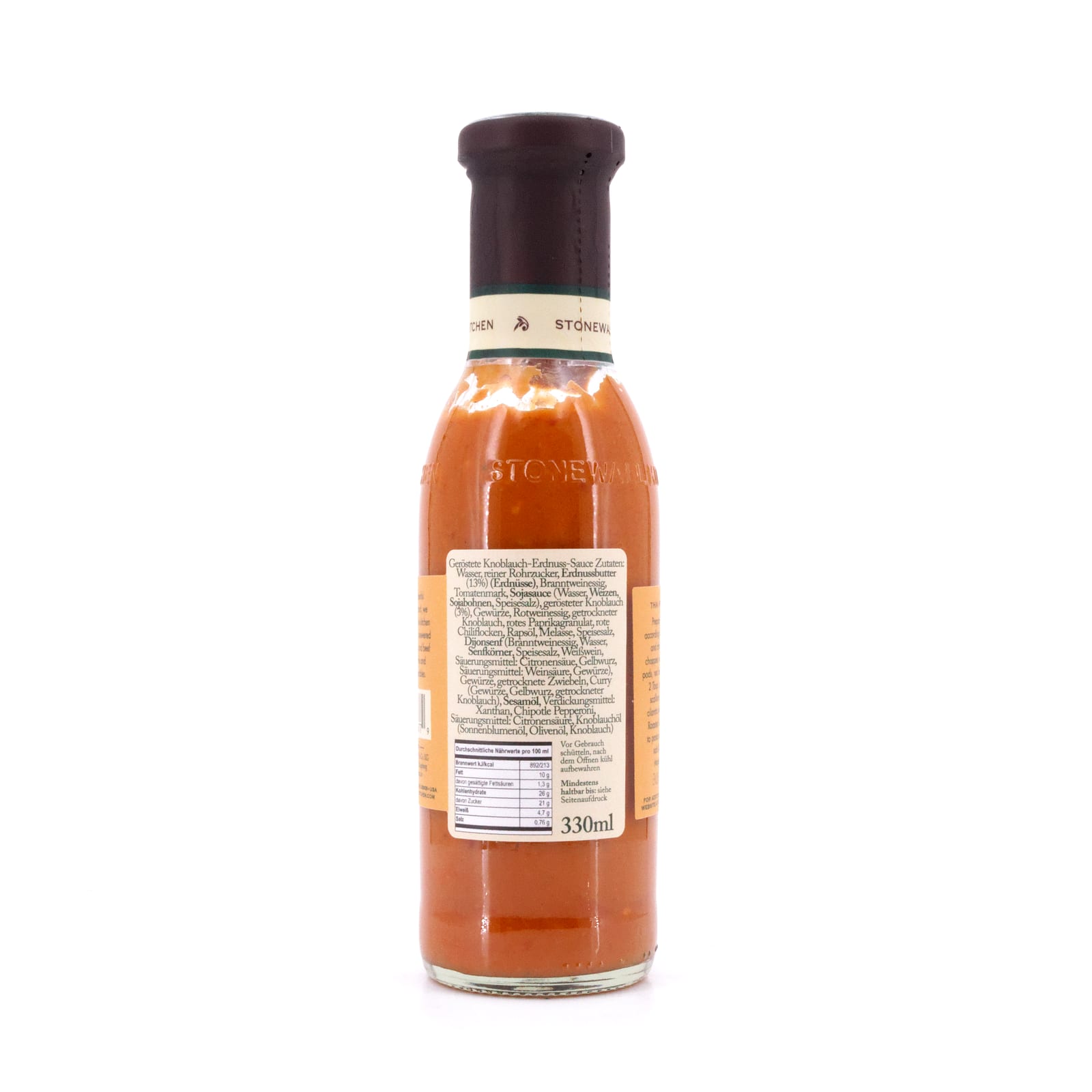 Zutaten: Wasser, reiner Rohrzucker, Erdnussbutter(13%) (Erdnüsse), Branntweinessig, Tomatenmark, Sojasauce (Wasser, Weizen, Sojabohnen, Speisesalz), gerösteter Knoblauch (3%), Rotweinessig, getrockneter Knoblauch, rotes Paprikagranulat, rote Chiliflocken, Rapsöl, Melasse, Speisesalz, Dijonsenf (Branntweinessig, Wasser, Senfkörner, Speisesalz, Weißwein, Säuerungsmittel: Citronensäure, Gelbwurz, Säuerungsmittel: Weinsäure, Gewürze), Gewürze, getrocknete Zwiebeln, Curry (Gewürze, Gelbwurz, getrockneter Knoblauch), Sesamöl, Verdickungsmittel: Xanthan, Chipotle Pepperoni, Säuerungsmittel: Citronensäure, Knoblauchöl (Sonnenblumenöl, Olivenöl, Knoblauch).