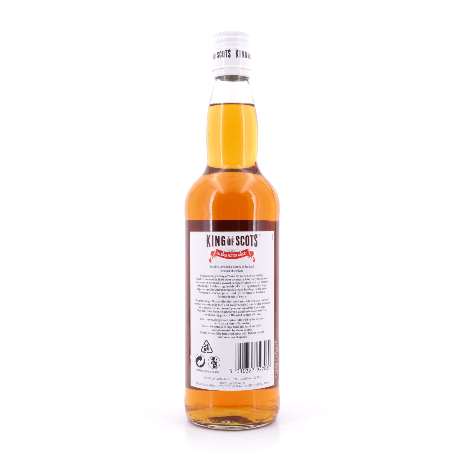 Seit dem Gründungsjahr 1948 gehört der „King of Scots Blended Whisky“, kreiert bereits 1886, als Marke zu „Douglas Laing & Co.“, dem in Glasgow beheimateten unabhängigen Abfüller. Heute kennt nur der enge Kreis der Familie Laing das genaue Mischungsverhältnis von Grain Whiskies und Whiskies aus ehemaligen Bourbon- sowie Sherry-Fässern. Ende der 1940er Jahre war dieser Whisky Blend das erste Produkt im Portfolio des frisch gegründeten Unternehmens und legte den Grundstein für dessen anhaltende Erfolgsgeschichte. Heute ist in zweiter Generation Fred Laing als Master Blender zuständig für die Auswahl der Fässer und ihre anschließende Vermählung.
