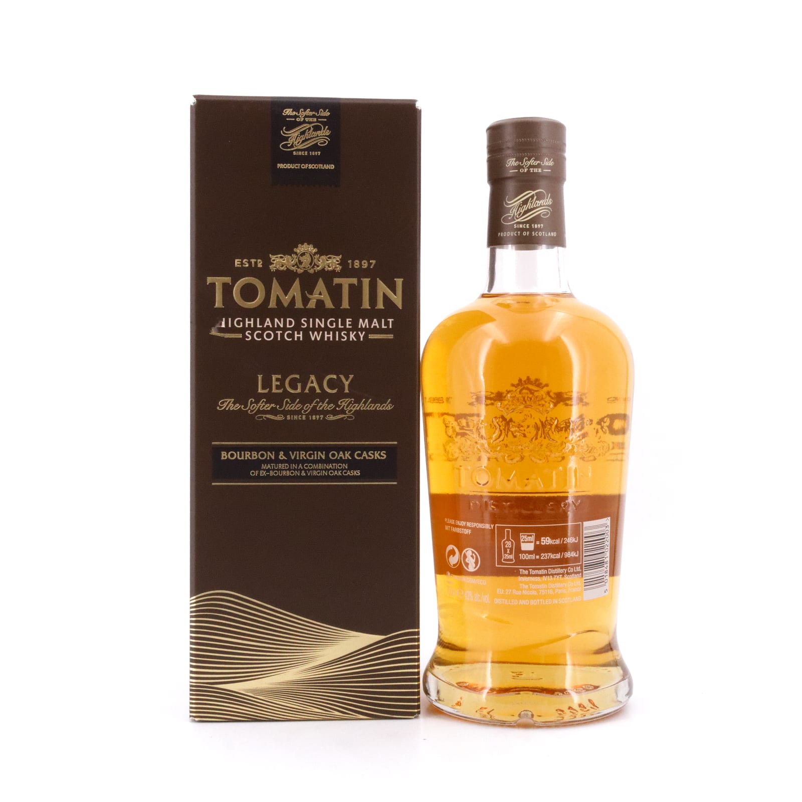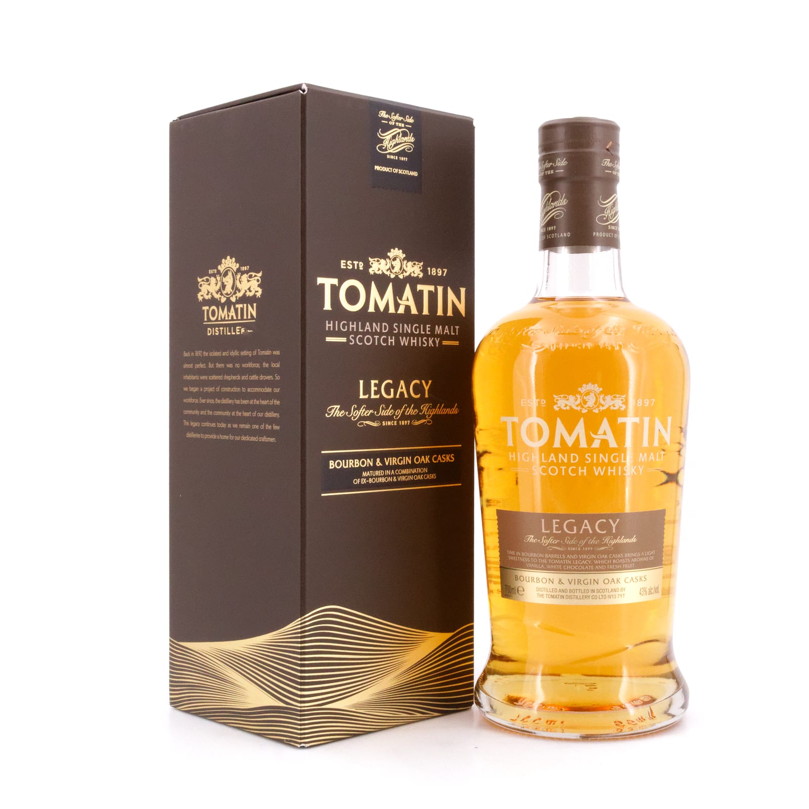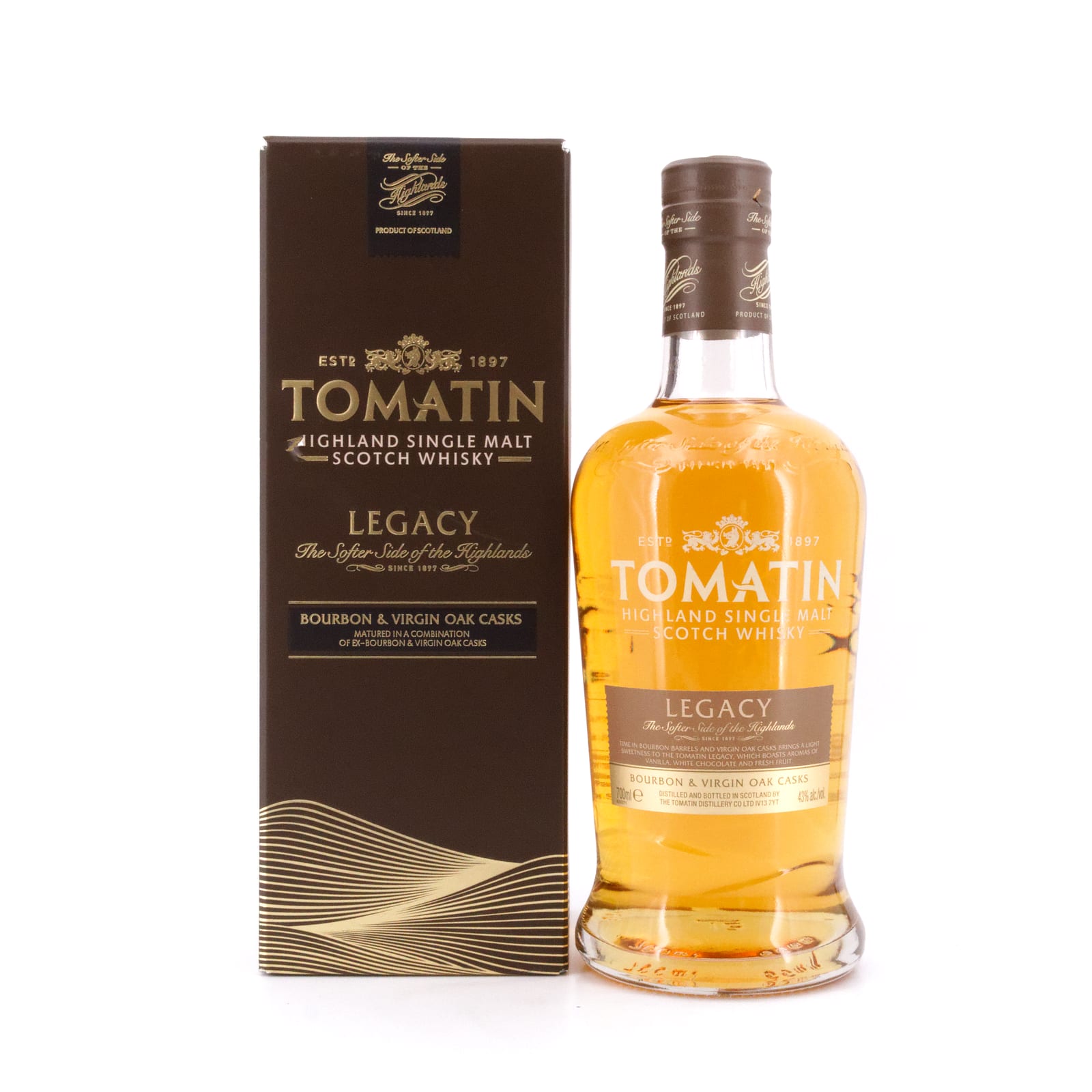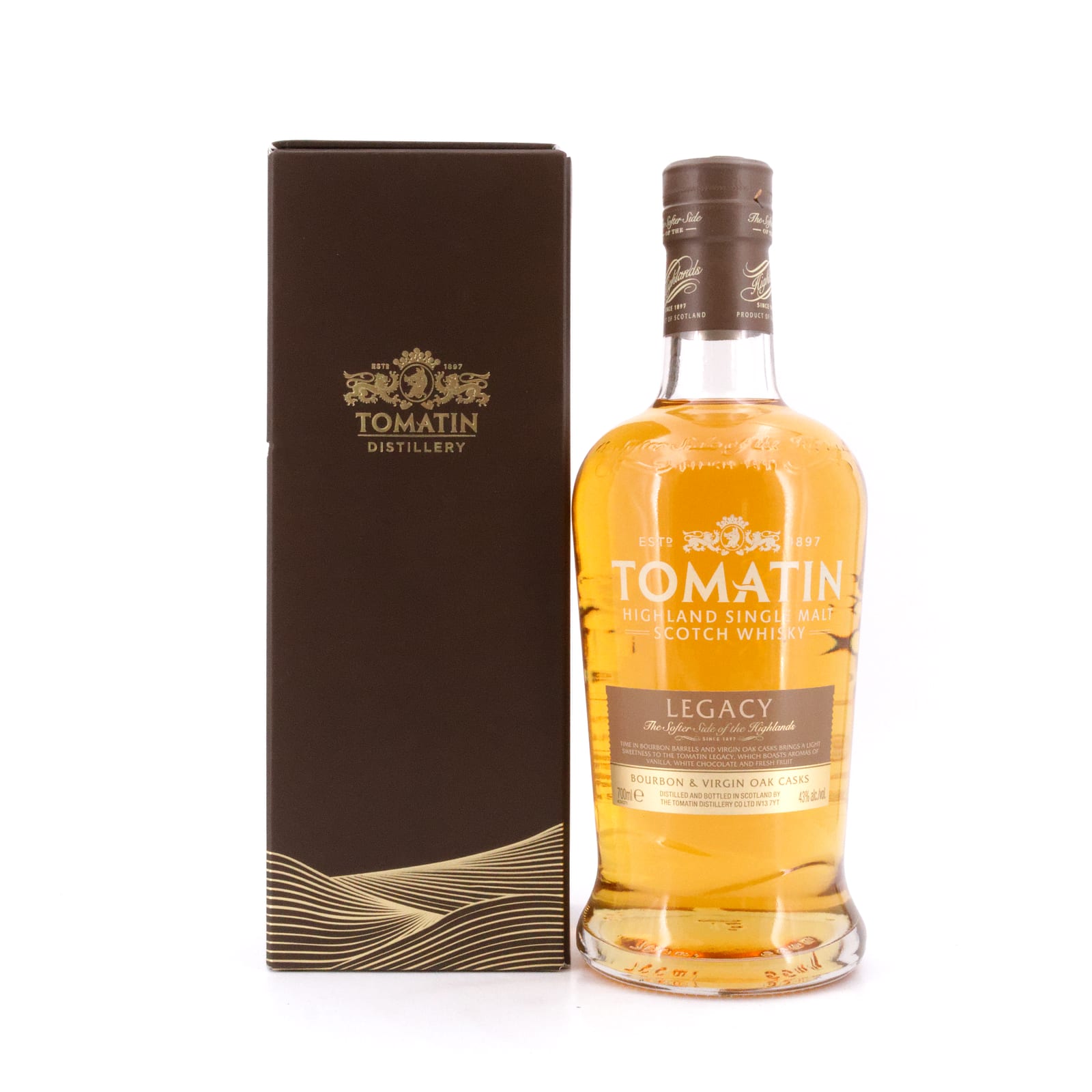 Der Tomatin Legacy wurde Mitte 2013 erstmals auf dem deutschen Whisky-Markt eingeführt und gehört seither zum Standardportfolio der Destillerie. Die Besonderheit des Legacy ist die Auswahl der Fässer, in denen er seine Reifung erfuhr. Diese fand zum einen in ehemaligen Bourbon-Fässern statt, darüber hinaus noch zusätzlich in Virgin Oak-Fässer, die für geschmacklichen Reichtum und einen weichen Körper verantwortlich sind.