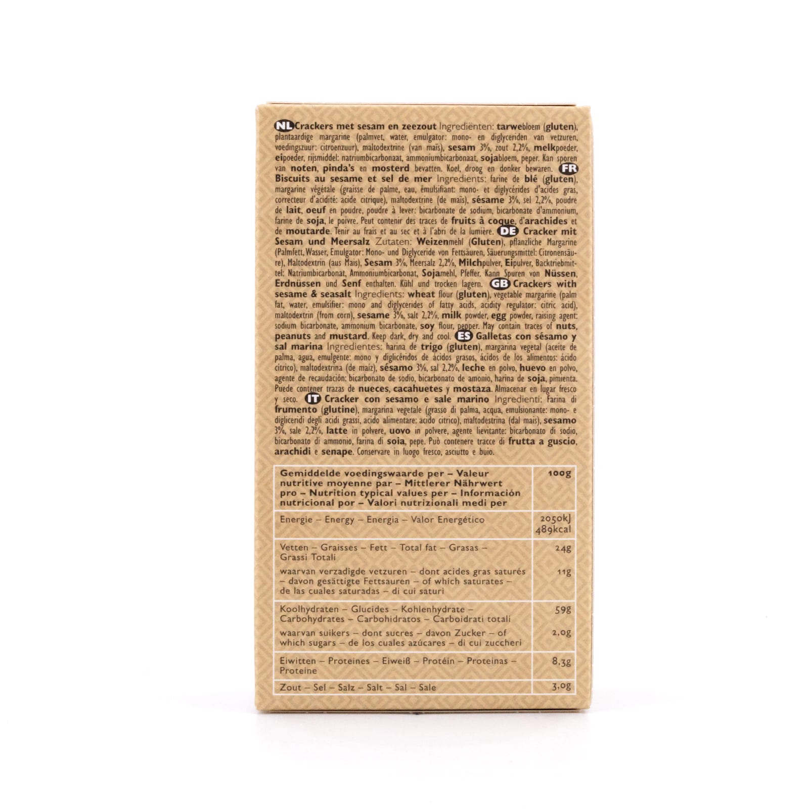 Zutaten: Weizenmehl (GLUTEN), maltodextrina ( Mais), PalmFett ( pflanzliche öle, Wasser, Emulgator E 471, Zitronensaüre) , Sesam 3%, Meersalz 2,2 %, SOJALETHICINE, MILCHPULVER, EIPULVER, Backtriebmittel : Natriumbikarbonat, Ammonnuimbikarbonat, Pfeffer.