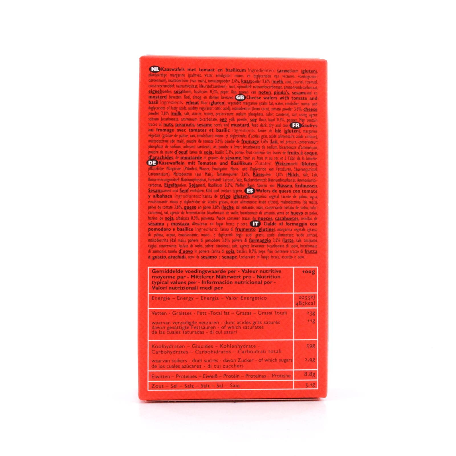 Zutaten: Weizenmehl (GLUTEN), pflanzliche Margarine (Palmfett, Wasser, Emulgator: Mono- und Diglyceride von Fettsäuren, Nahrungsmittelsäure: Zitronensäure), Maltodextrin (aus Mais), Tomatenpulver 3,7%, Käsepulver 3% (Milch, Salz, Lab, Konservierungsmittel: Natriumphosphat, Farbe: Annatto, Carotin), Salz, Eigelbpulver, Triebmittel: Natriumbicarbonat, Ammoniumbicarbonat, Sojamehl, Basilikum 0,3%, Pfeffer.